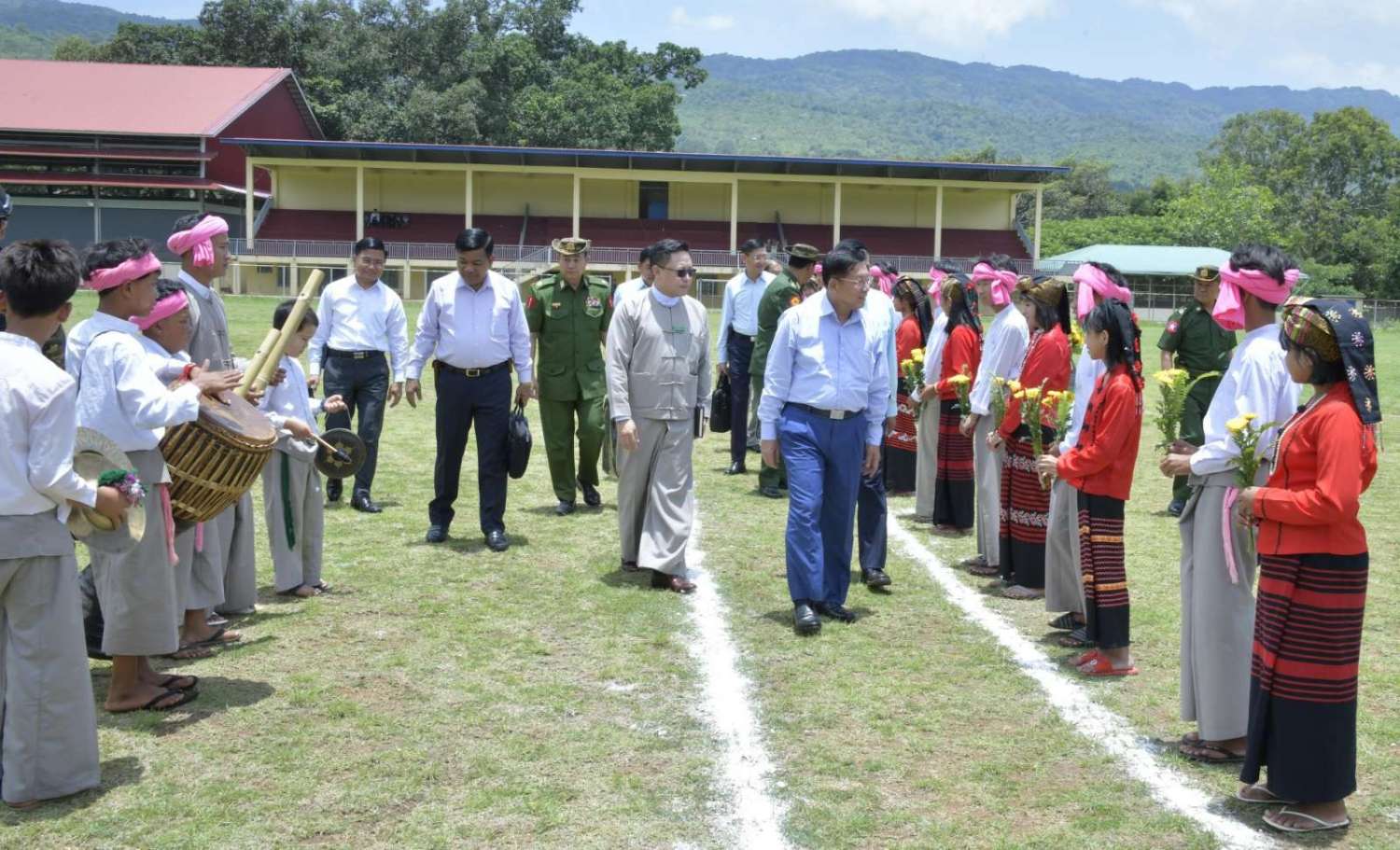 ဦးစွာ နိုင်ငံတော်စီမံအုပ်ချုပ်ရေးကောင်စီဥက္ကဋ္ဌ နိုင်ငံတော်ဝန်ကြီးချုပ်နှင့် အဖွဲ့ဝင်များသည် ဓနုကိုယ်ပိုင်အုပ်ချုပ်ခွင့်ရဒေသ ပင်းတယမြို့သို့ ရောက်ရှိကြရာ ဓနုကိုယ်ပိုင်အုပ်ချုပ်ခွင့်ရဒေသစီမံအုပ်ချုပ်ရေးအဖွဲ့ဥက္ကဋ္ဌ ဦးအာကာလင်းနှင့် အဖွဲ့ဝင်များ၊ ဒေသခံတိုင်းရင်းသားများက ရိုးရာအိုးစည်များဖြင့် လှိုက်လှဲနွေးထွေးစွာ ကြိုဆိုနှုတ်ဆက်ကြသည်။
