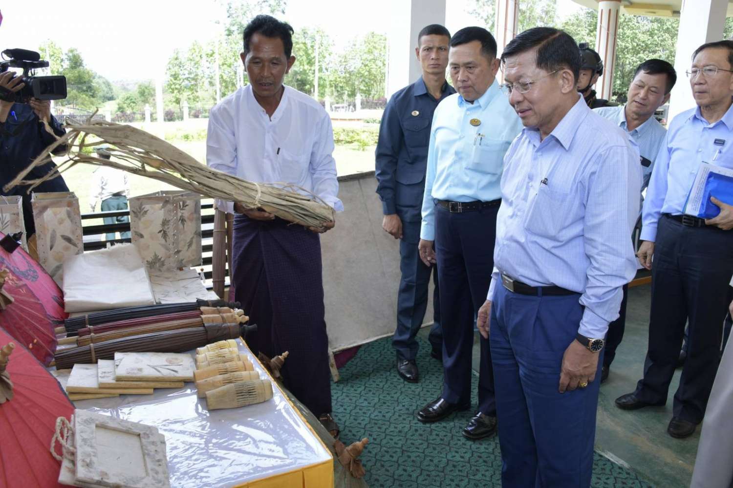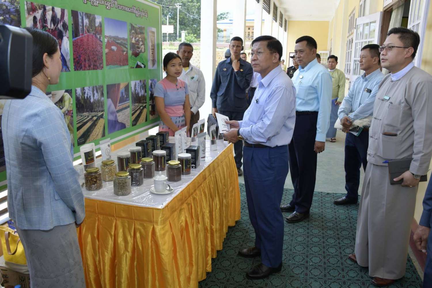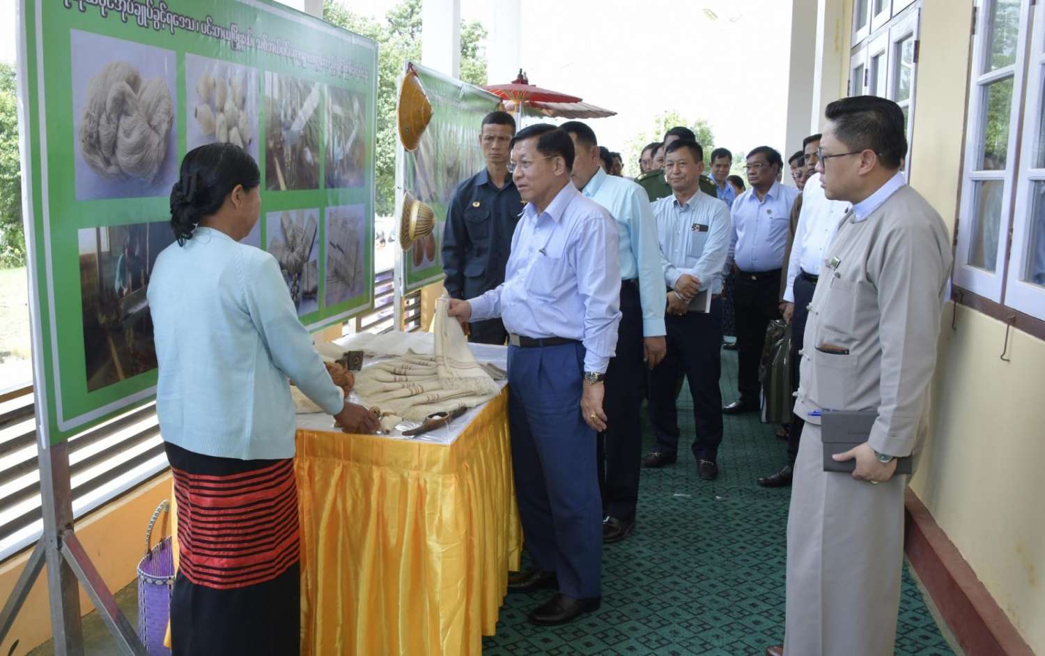 ယင်းနောက် နိုင်ငံတော်စီမံအုပ်ချုပ်ရေးကောင်စီဥက္ကဋ္ဌ နိုင်ငံတော်ဝန်ကြီးချုပ်သည် ခင်းကျင်းပြသထားသည့် ဒေသထွက်ကုန်ပစ္စည်းများ၊ စားသောက်ကုန်၊ လူသုံးကုန်၊ စက်မှုလက်မှုထုတ်ကုန်၊ ရိုးရာလက်မှုထုတ်ကုန်များ၊ အဝတ်အထည်များ စသည့် ထုတ်ကုန်ပစ္စည်းများ ခင်းကျင်းပြသထားရှိမှုများကို ပြကွက်တစ်ခုချင်းစီအလိုက် စိတ်ဝင်တစားဖြင့် လေ့လာခဲ့ပြီး ဈေးကွက်ရရှိမှုအခြေအနေများကို မေးမြန်းဆွေးနွေးရာလုပ်ငန်းအလိုက် စီးပွားရေးလုပ်ငန်းရှင်များက လိုက်လံရှင်းလင်းတင်ပြခဲ့ကြောင်း သတင်းရရှိသည်။