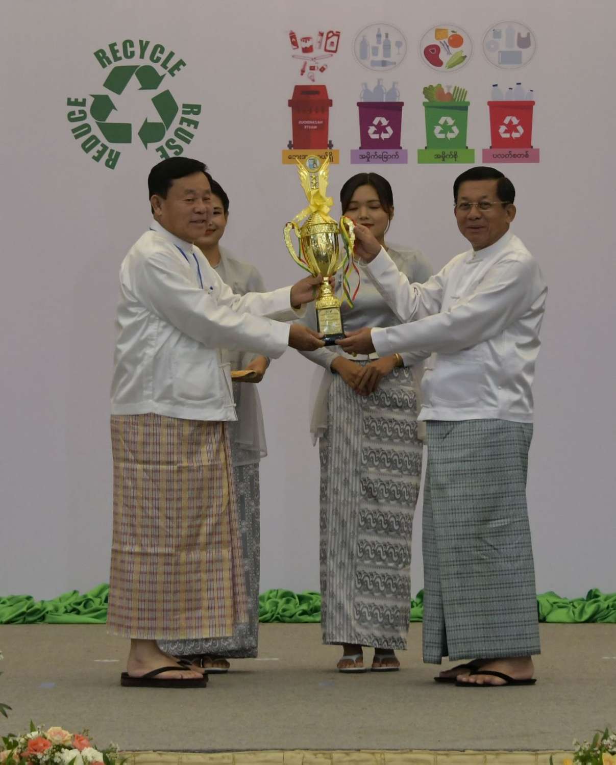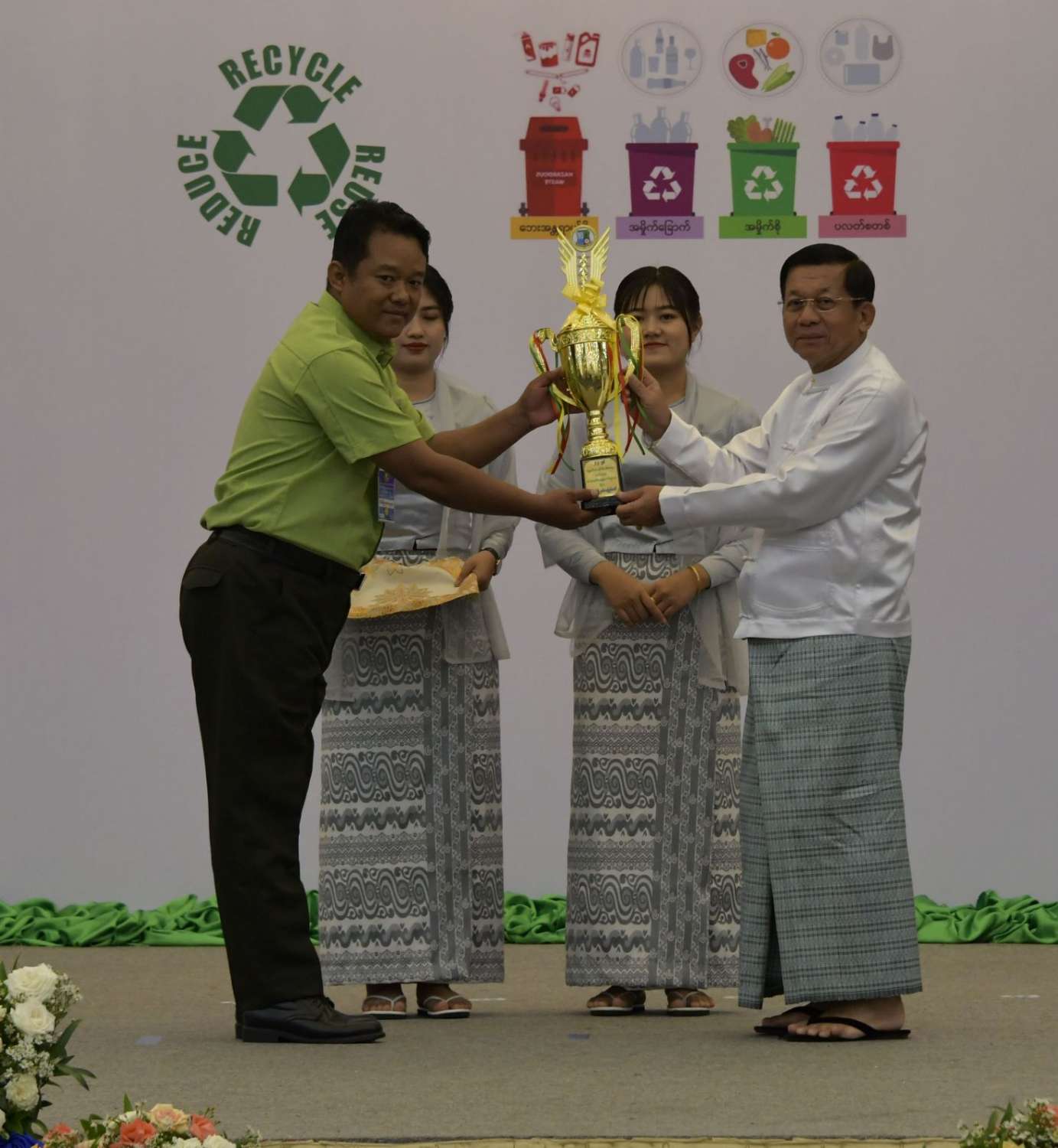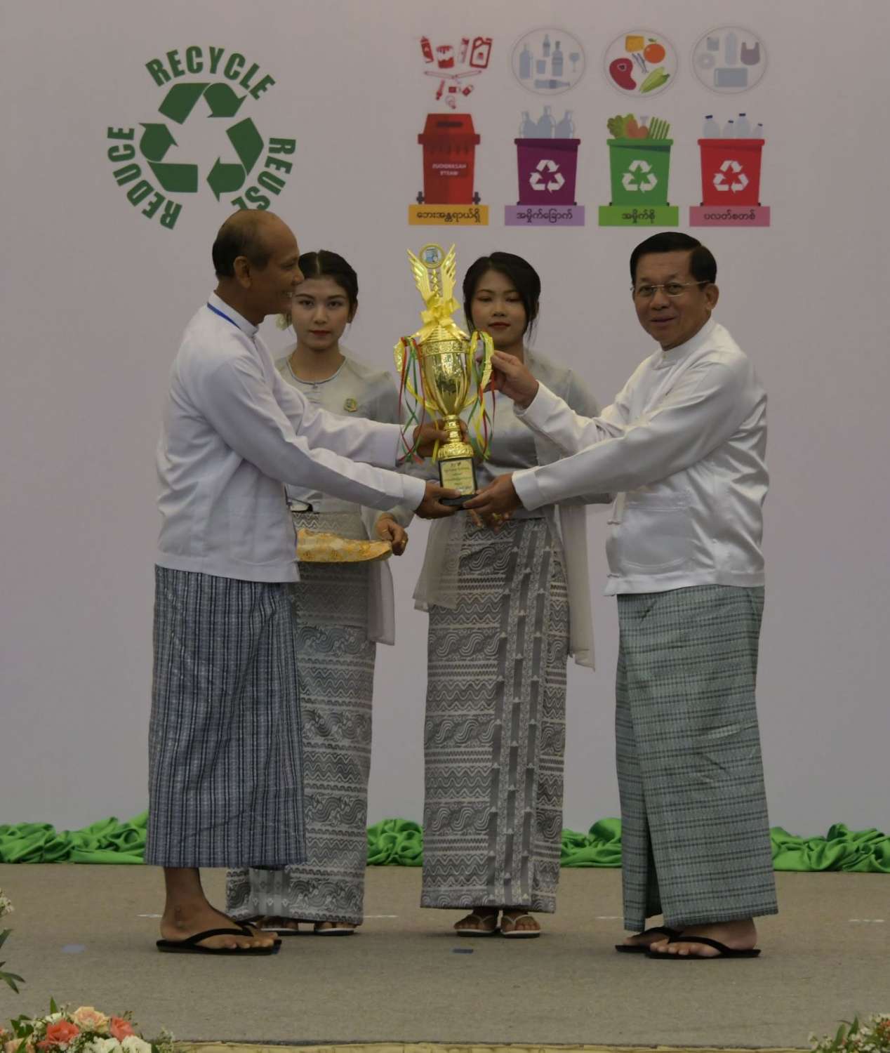 ထို့နောက် နိုင်ငံတော်စီမံအုပ်ချုပ်ရေးကောင်စီဥက္ကဋ္ဌ နိုင်ငံတော်ဝန်ကြီးချုပ်က ပတ်ဝန်းကျင်စီမံ ခန့်ခွဲမှုကောင်းမွန်သောမြို့ဆုရရှိသည့် နေပြည်တော်ကောင်စီနယ်မြေ ဇမ္ဗူသီရိမြို့နယ်မှ တာဝန်ရှိသူထံလည်းကောင်း၊ ပတ်ဝန်းကျင်စီမံခန့်ခွဲမှုကောင်းမွန်သော ကျေးရွာဆုရရှိသည့် ဧရာဝတီတိုင်းဒေသကြီး မော်လမြိုင်ကျွန်းမြို့နယ် မရဲ့အုန်းပင်စုကျေးရွာမှ တာဝန်ရှိသူထံလည်းကောင်း၊ ပတ်ဝန်းကျင်စီမံခန့်ခွဲမှု ကောင်းမွန်သော စက်ရုံဆုရရှိသည့် Global Earth Seafood Processing Plant and Cold Storage Facility Global Earth ARGO and AQUA Industry Public Company Limited မှ တာဝန်ရှိသူထံလည်းကောင်း ဆုများပေးအပ်ချီးမြှင့်သည်။