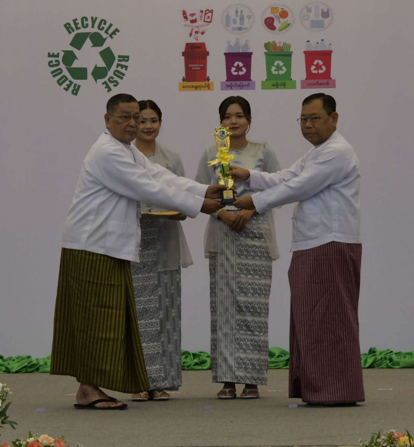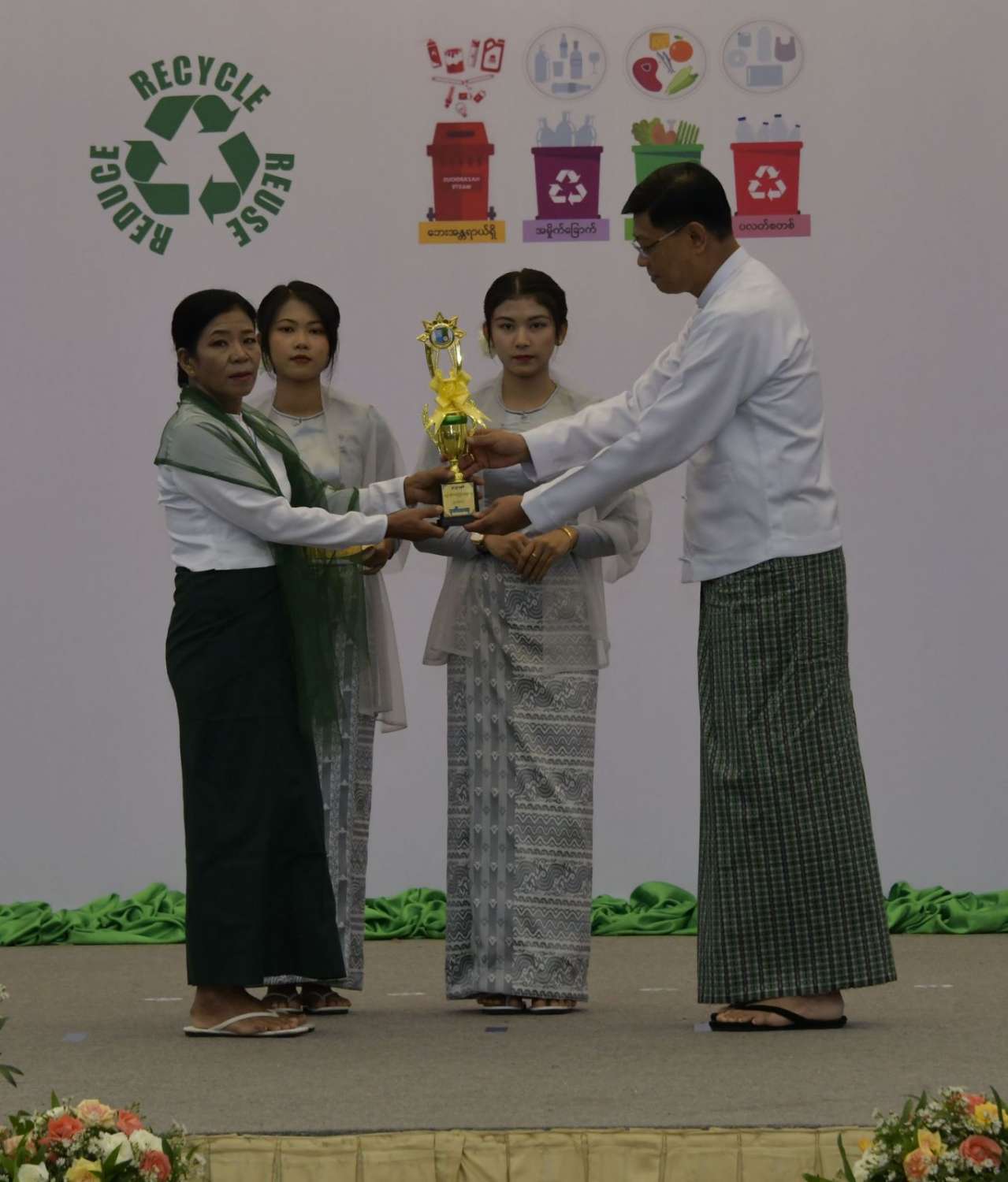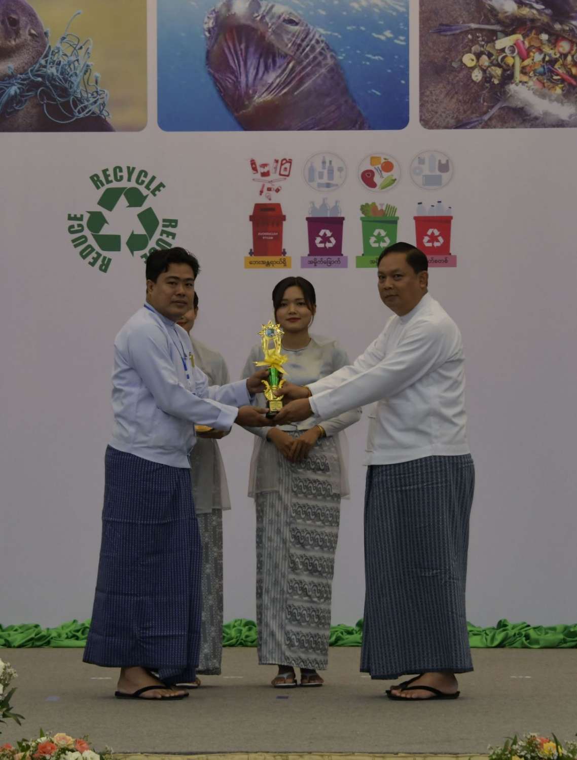 ထို့နောက် နိုင်ငံတော်စီမံအုပ်ချုပ်ရေးကောင်စီဥက္ကဋ္ဌ နိုင်ငံတော်ဝန်ကြီးချုပ်က ပတ်ဝန်းကျင်စီမံ ခန့်ခွဲမှုကောင်းမွန်သောမြို့ဆုရရှိသည့် နေပြည်တော်ကောင်စီနယ်မြေ ဇမ္ဗူသီရိမြို့နယ်မှ တာဝန်ရှိသူထံလည်းကောင်း၊ ပတ်ဝန်းကျင်စီမံခန့်ခွဲမှုကောင်းမွန်သော ကျေးရွာဆုရရှိသည့် ဧရာဝတီတိုင်းဒေသကြီး မော်လမြိုင်ကျွန်းမြို့နယ် မရဲ့အုန်းပင်စုကျေးရွာမှ တာဝန်ရှိသူထံလည်းကောင်း၊ ပတ်ဝန်းကျင်စီမံခန့်ခွဲမှု ကောင်းမွန်သော စက်ရုံဆုရရှိသည့် Global Earth Seafood Processing Plant and Cold Storage Facility Global Earth ARGO and AQUA Industry Public Company Limited မှ တာဝန်ရှိသူထံလည်းကောင်း ဆုများပေးအပ်ချီးမြှင့်သည်။