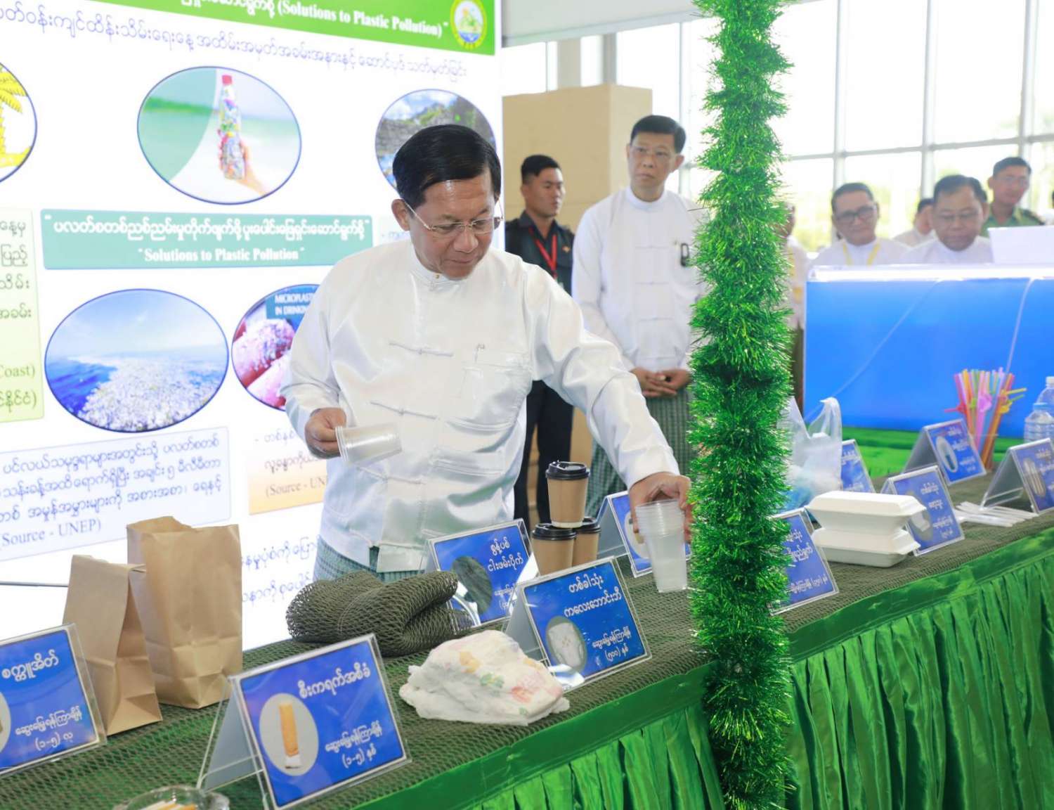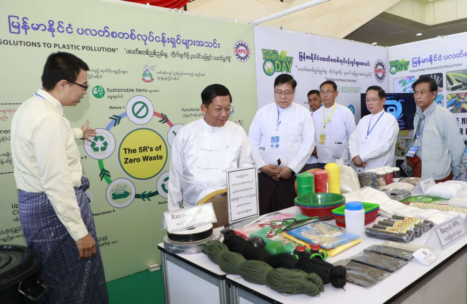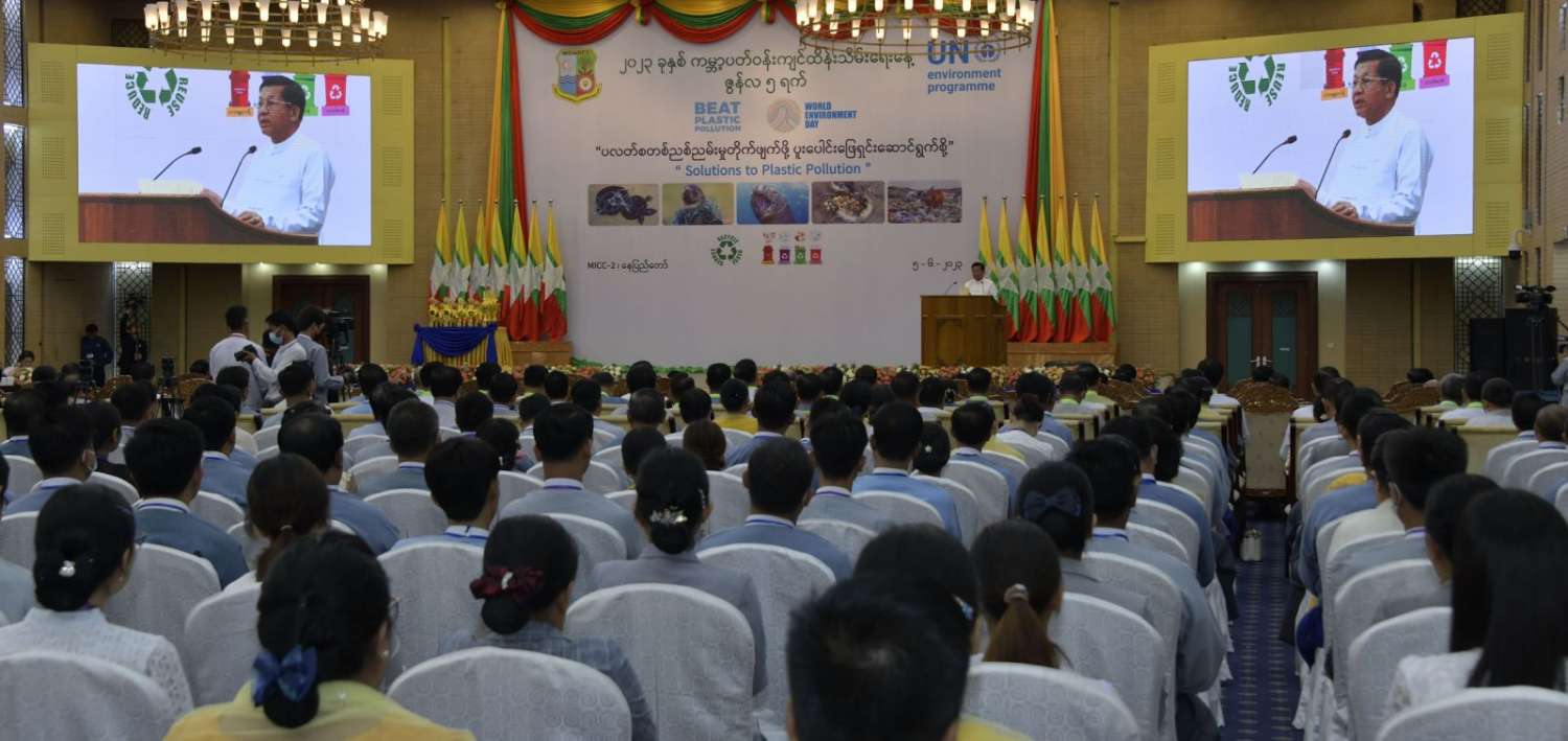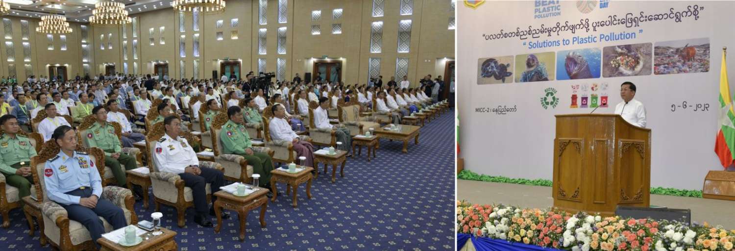 ဦးစွာ နိုင်ငံတော်စီမံအုပ်ချုပ်ရေးကောင်စီဥက္ကဋ္ဌ နိုင်ငံတော်ဝန်ကြီးချုပ်က အမှာစကားပြောကြားရာတွင် မိမိတို့နိုင်ငံအပါအဝင် ကမ္ဘာ့နိုင်ငံများအားလုံး၏ ပတ်ဝန်းကျင်ဆိုင်ရာပြဿနာများကို ဝိုင်းဝန်းဖြေရှင်း ဆောင်ရွက်လာကြစေရန်အတွက် ၁၉၇၂ ခုနှစ်တွင် ကျင်းပခဲ့သည့် ကုလသမဂ္ဂအထွေထွေညီလာခံက ဇွန်လ ၅ ရက်နေ့ကို ကမ္ဘာ့ပတ်ဝန်းကျင်ထိန်းသိမ်းရေးနေ့အဖြစ် သတ်မှတ်ခဲ့ပါကြောင်း၊ ၁၉၇၃ ခုနှစ်မှစတင်ပြီး ကမ္ဘာ့နိုင်ငံအသီးသီးတွင် နှစ်စဉ်ပတ်ဝန်းကျင် ထိန်းသိမ်းရေးနေ့ အထိမ်းအမှတ် အခမ်းအနားများကိုကျင်းပခဲ့သည်မှာ ယခုအခါ နှစ်(၅၀)ပြည့်မြောက်သည့် ရွှေရတုကိုရောက်ရှိခဲ့ပြီဖြစ်ပါကြောင်း၊ ယခုနှစ် ကမ္ဘာ့ပတ်ဝန်းကျင်ထိန်းသိမ်းရေးနေ့ အထိမ်းအမှတ် ဆောင်ပုဒ်အဖြစ် “ပလတ်စတစ်ညစ်ညမ်းမှု တိုက်ဖျက်ဖို့ ပူးပေါင်းဖြေရှင်းဆောင်ရွက်စို့ (Solutions to Plastic Pollution)” ဟု သတ်မှတ်ထားပါကြောင်း၊ ယခုနှစ်ဆောင်ပုဒ်၏ ရည်ရွယ်ချက်မှာ ကမ္ဘာတစ်ဝန်းလုံးရှိ လူသားတို့၏ ပြုမူဆောင်ရွက်ချက်များကြောင့် ဖြစ်ပေါ်လာသည့် ပလတ်စတစ်ညစ်ညမ်းမှုအန္တရာယ်ဆိုင်ရာ အကျိုးဆက်များကို နိုင်ငံများအားလုံးဖြေရှင်း ဆောင်ရွက်ရန်၊ ပလတ်စတစ်ညစ်ညမ်းမှု ကိုင်တွယ် ဖြေရှင်းခြင်းကို အရှိန်မြှင့်တင်ဆောင်ရွက်ရန်၊ စွန့်ပစ်ပစ္စည်းအနည်းဆုံးနှင့် ပတ်ဝန်းကျင်ကို ထိခိုက်မှုအနည်းဆုံးဖြစ်စေသည့် ပတ်လည်စီးပွားရေးလုပ်ငန်း (Circular Economy) သို့ အသွင်ကူးပြောင်းရန် အချိန်ကျရောက်ပြီဖြစ်သည်ကို သတိပေးလိုက်ခြင်းပင် ဖြစ်ပါကြောင်း။