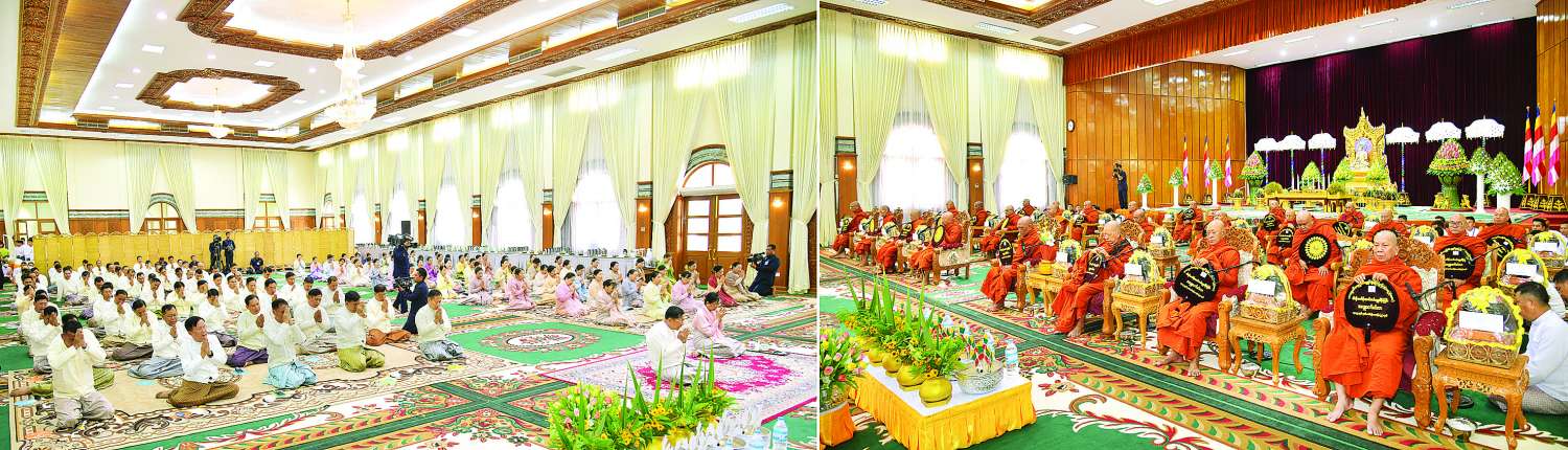 ဦးစွာ နိုင်ငံတော်စီမံအုပ်ချုပ်ရေးကောင်စီဥက္ကဋ္ဌ တပ်မတော်ကာကွယ်ရေးဦးစီးချုပ်က အနော်ရထာခန်းမအတွင်းရှိ ဗုဒ္ဓရုပ်ပွားတော်မြတ်အား ဖူးမြော်ကြည်ညို၍ မြသပိတ်ဆွမ်းတော်နှင့် ပန်း၊ ရေချမ်း၊ ဆီမီး တို့ကို ဆက်ကပ်လှူဒါန်းသည်။