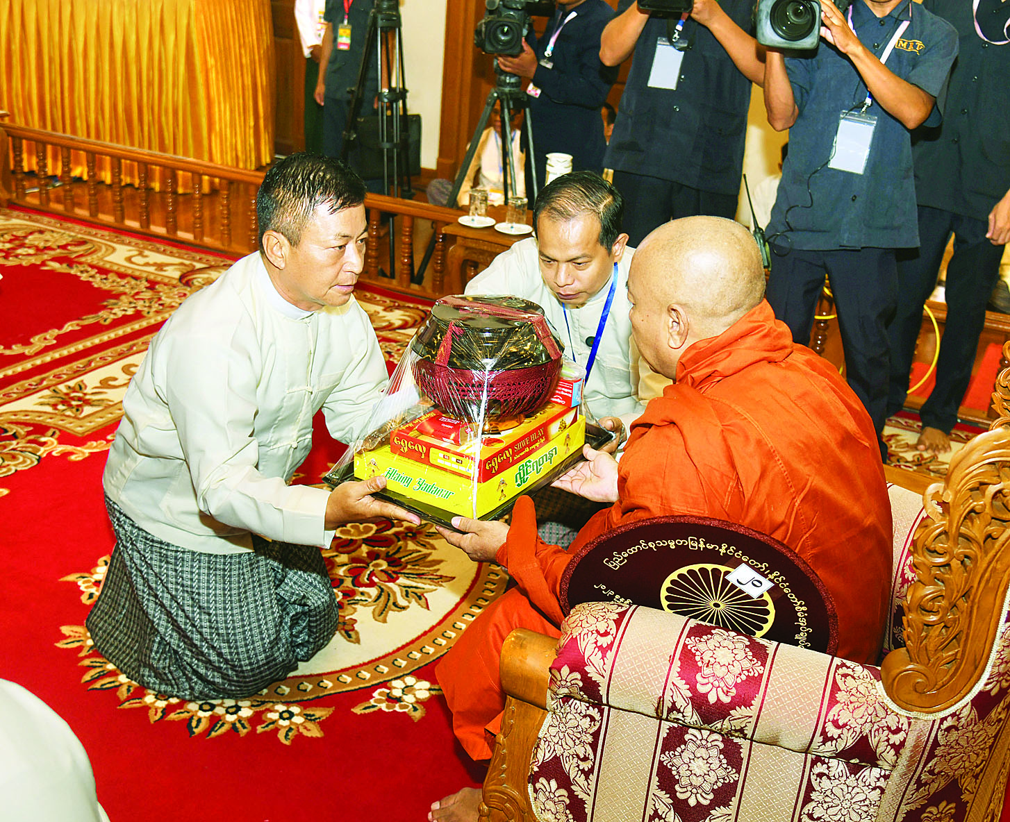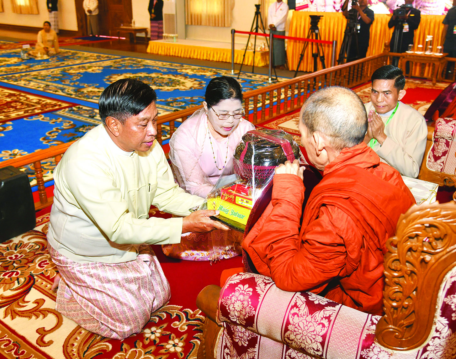 ထို့နောက် နိုင်ငံတော်စီမံအုပ်ချုပ်ရေးကောင်စီ ဒုတိယဥက္ကဋ္ဌ ဒုတိယဝန်ကြီးချုပ်နှင့်ဇနီးတို့က နိုင်ငံတော်သံဃမဟာနာယကအဖွဲ့ ဒုတိယဥက္ကဋ္ဌ၊ ရှမ်းပြည်နယ်၊ ကျောက်မဲမြို့၊ သီဟိုဠ်ပရိယတ္တိ စာသင်တိုက် ပဓာနနာယက၊ အဂ္ဂမဟာပဏ္ဍိတ ဒေါက်တာဘဒ္ဒန္တစန္ဒနသာရ ဆရာတော်ကြီးထံ ဝါဆိုသင်္ကန်းနှင့်လှူဖွယ်ပစ္စည်းများကို ဆက်ကပ်လှူဒါန်းသည်။ ဆက်လက်ပြီး ကောင်စီအတွင်းရေးမှူးနှင့်ဇနီး၊ တွဲဖက်အတွင်းရေးမှူးနှင့်ဇနီး၊ ကောင်စီဝင်များနှင့်ဇနီးများ၊ ပြည်ထောင်စုအဆင့် ပုဂ္ဂိုလ်များ၊ ပြည်ထောင်စုဝန်ကြီးများ၊ ညှိနှိုင်းကွပ်ကဲရေးမှူး(ကြည်း၊ ရေ၊လေ) နှင့် အဆင့်မြင့်တပ်မတော်အရာရှိကြီးများက ဆရာတော်၊ သံဃာတော်များထံ ဝါဆိုသင်္ကန်းနှင့်လှူဖွယ်ပစ္စည်းများကို အသီးသီးဆက်ကပ်လှူဒါန်းကြသည်။