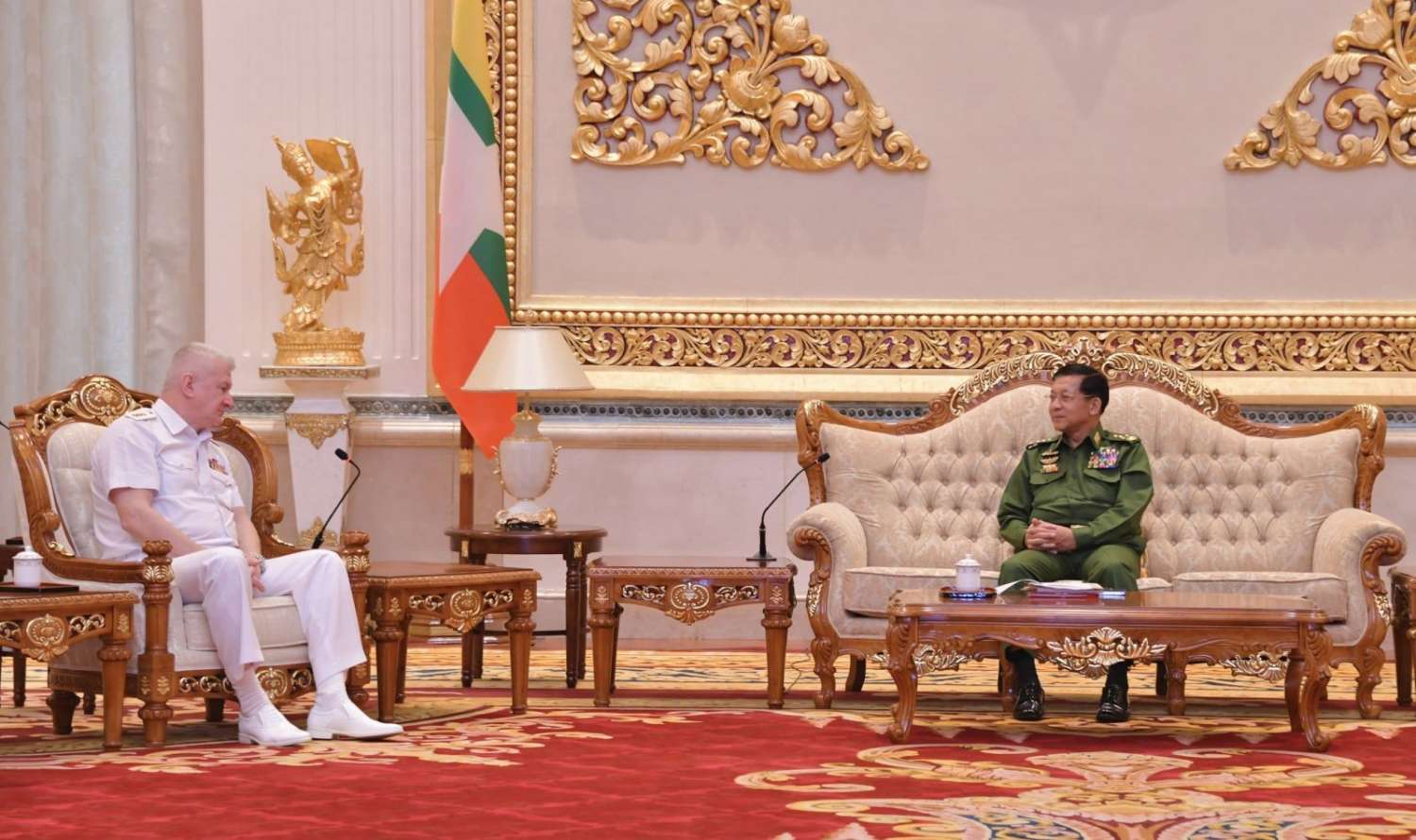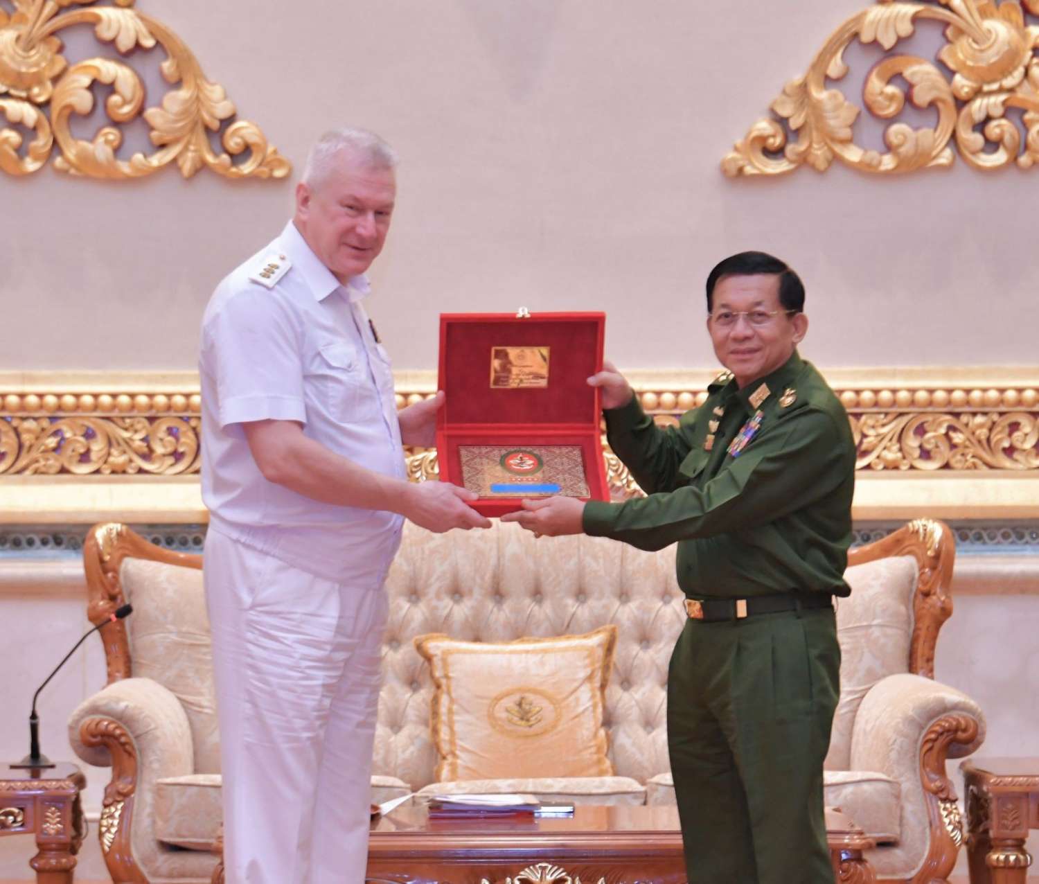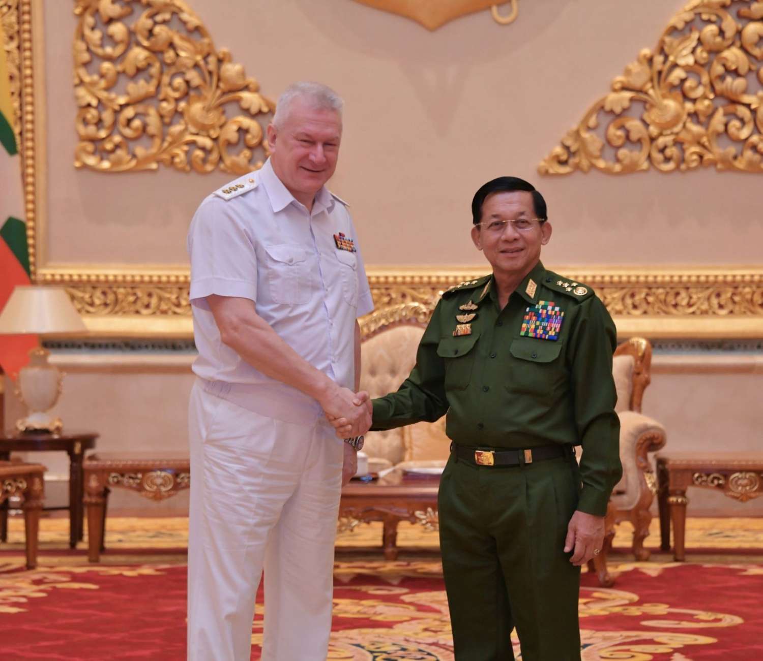 နိုင်ငံတော်စီမံအုပ်ချုပ်ရေးကောင်စီ ဥက္ကဋ္ဌ တပ်မတော်ကာကွယ်ရေးဦးစီးချုပ် ဗိုလ်ချုပ်မှူးကြီး မင်းအောင်လှိုင် သည် ရုရှားဖက်ဒရေးရှင်းနိုင်ငံ ရေတပ်ဦးစီးချုပ် Admiral Nikolai A.EVMENOV ဦးဆောင်သောကိုယ်စားလှယ်အဖွဲ့အား ယနေ့နံနက်ပိုင်းတွင် နေပြည်တော်ရှိ ဇေယျာသီရိဗိမာန် ဧည့်ခန်းမဆောင်၌ လက်ခံတွေ့ဆုံသည်။