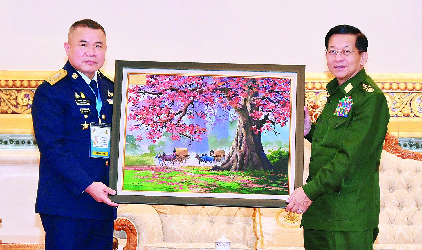 နိုင်ငံတော်စီမံအုပ်ချုပ်ရေးကောင်စီဥက္ကဋ္ဌ တပ်မတော်ကာကွယ်ရေးဦးစီးချုပ် ဗိုလ်ချုပ်မှူးကြီး မင်းအောင်လှိုင် ထိုင်းဘုရင့်လေတပ်ဦးစီးချုပ် ဦးဆောင်သည့် ကိုယ်စားလှယ်အဖွဲ့အား လက်ခံတွေ့ဆုံ