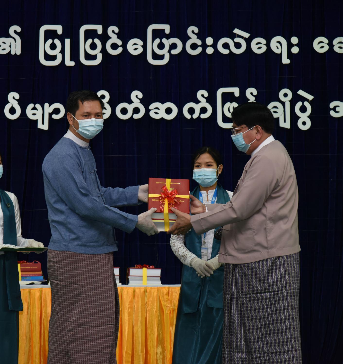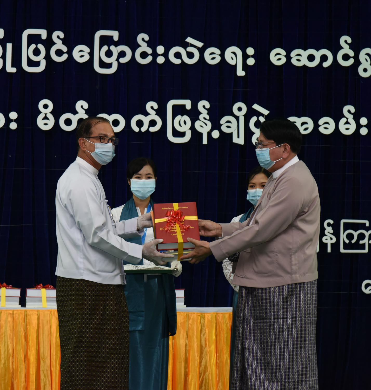 ထို့နောက် မှတ်တမ်းစာအုပ်များကို ပြည်ထောင်စုဝန်ကြီး ဒေါက်တာဖေမြင့်က ဥပဒေပြုရေးမဏ္ဍိုင် ကိုယ်စား ပြည်ထောင်စုလွှတ်တော်ရုံး အမြဲတမ်းအတွင်းဝန် ဦးကျော်စိုးအား လည်းကောင်း၊ အုပ်ချုပ်ရေးမဏ္ဍိုင်ကိုယ်စား ရင်းနှီးမြှုပ်နှံမှုနှင့် နိုင်ငံခြားစီးပွား ဆက်သွယ်ရေးဝန်ကြီးဌာန အမြဲတမ်းအတွင်းဝန် ဦးအောင်နိုင်ဦး အားလည်းကောင်း၊ တရားစီရင်ရေးမဏ္ဍိုင် ကိုယ်စား ပြည်ထောင်စုရှေ့နေချုပ်ရုံး ဒုတိယအမြဲတမ်း အတွင်းဝန် ဦးသန့်စင်အား လည်းကောင်း၊ တပ်မတော်သတင်းမှန် ပြန်ကြားရေးအဖွဲ့ကိုယ်စား တပ်မတော်ကာကွယ်ရေး ဦးစီးချုပ်ရုံးမှ ဗိုလ်မှူးကြီး စိုးသန်းအားလည်းကောင်း၊ အမျိုးသား မှတ်တမ်းများ မော်ကွန်းတိုက်ဦးစီးဌာနမှ ဒုတိယညွှန်ကြားရေးမှူးချုပ် ဒေါက်တာ မျိုးမင်းကြည်ဝင်း အားလည်းကောင်း၊ အမျိုးသား စာကြည့်တိုက်မှ ညွှန်ကြားရေးမှူး ဒေါ်မြဦး အားလည်းကောင်း၊ သတင်းမီဒီယာများ ကိုယ်စား လျှပ်တပြက်ဂျာနယ်မှ နေပြည်တော် တာဝန်ခံ ရဲရဲ (ပျဉ်းမနား) အားလည်းကောင်း ပေးအပ်သည်။