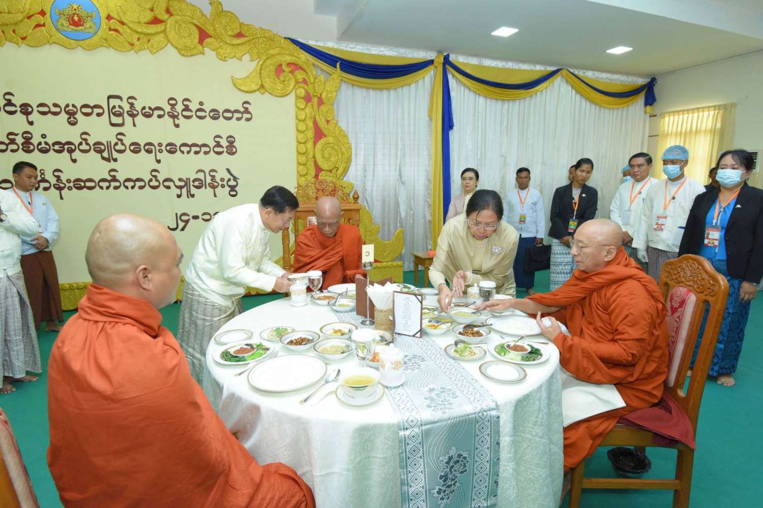 ယင်းနောက် အခမ်းအနားကို “ဗုဒ္ဓသာသနံ စိရံတိဋ္ဌတု” သုံးကြိမ်ရွတ်ဆိုဆုတောင်း၍ အခမ်းအနားကို ရုပ်သိမ်းလိုက်သည်။ အခမ်းအနားအပြီးတွင် သန်လျင်မင်းကျောင်းဆရာတော်ကြီးအမှူးပြုသည့် ဆရာတော်၊ သံဃာတော်များအား နိုင်ငံတော်စီမံအုပ်ချုပ်ရေးကောင်စီဥက္ကဋ္ဌနှင့် ဇနီး၊ ဧည့်ပရိသတ်များက နေ့ဆွမ်း ဆက်ကပ်လှူဒါန်းခဲ့သည်။