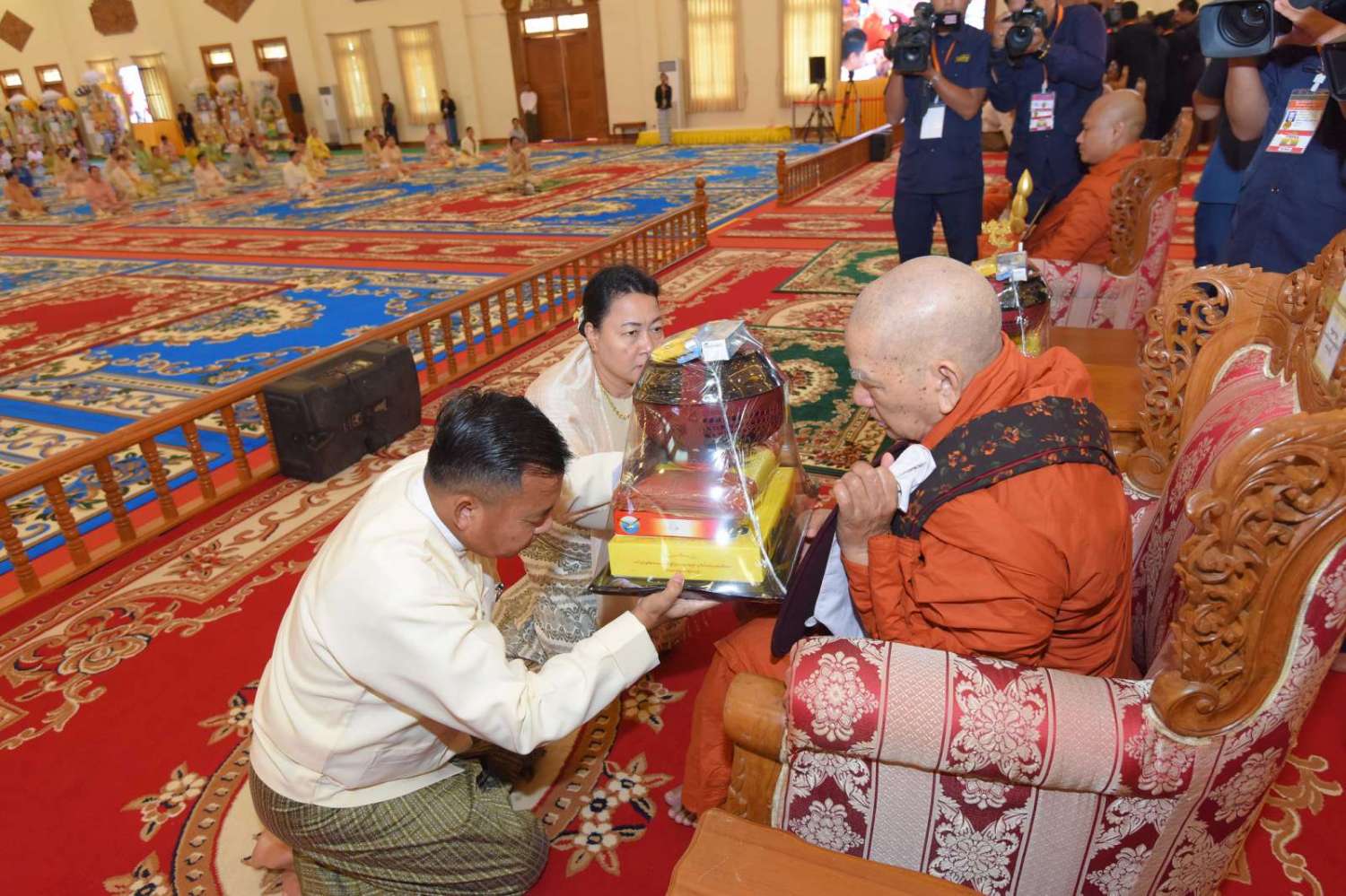 အခမ်းအနားသို့ နိုင်ငံတော်သံဃမဟာနာယကအဖွဲ့အကျိုးတော်ဆောင်၊ သန်လျင်မြို့၊ မင်းကျောင်းပထမပြန်စာသင်တိုက် ပဓာနနာယက အဂ္ဂမဟာပဏ္ဍိတ အဂ္ဂမဟာသဒ္ဓမ္မ ဇောတိကဓဇ ဒေါက်တာဘဒ္ဒန္တစန္ဒိမာဘိဝံသ၊ နိုင်ငံတော်သံဃမဟာနာယကအဖွဲ့ ဒုတိယဥက္ကဋ္ဌ ကျောက်မဲမြို့၊ သီဟိုဠ်ပရိယတ္တိစာသင်တိုက် ပဓာနနာယက အဂ္ဂမဟာပဏ္ဍိတ ဒေါက်တာဘဒ္ဒန္တစန္ဒနသာရနှင့် ဥပ္ပါတသန္တိစေတီတော် ဂေါပကအဖွဲ့ ဩဝါဒါစရိယဆရာတော်ကြီးများ အမှူးပြုသည့် ပင့်ဖိတ်ထားသော ဆရာတော်ကြီး ၂၇ ပါး ကြွရောက်ချီးမြှင့်တော်မူကြပြီး နိုင်ငံတော်စီမံအုပ်ချုပ်ရေးကောင်စီဥက္ကဋ္ဌ နိုင်ငံတော်ဝန်ကြီးချုပ် ဗိုလ်ချုပ်မှူးကြီး မင်းအောင်လှိုင်နှင့် ဇနီး ဒေါ်ကြူကြူလှတို့နှင့်အတူ ကောင်စီအတွင်းရေးမှူး၊ တွဲဖက်အတွင်းရေးမှူးနှင့် ဇနီး၊ ကောင်စီဝင်များနှင့် ဇနီးများ၊ ပြည်ထောင်စုအဆင့်ပုဂ္ဂိုလ်များ၊ ပြည်ထောင်စုဝန်ကြီးများ၊ နေပြည်တော်ကောင်စီဥက္ကဋ္ဌ၊ တပ်မတော်အရာရှိကြီးများနှင့် ဇနီးများ၊ နေပြည်တော်တိုင်းစစ်ဌာနချုပ် တိုင်းမှူးနှင့် တာဝန်ရှိသူများ တက်ရောက်ကြသည်။