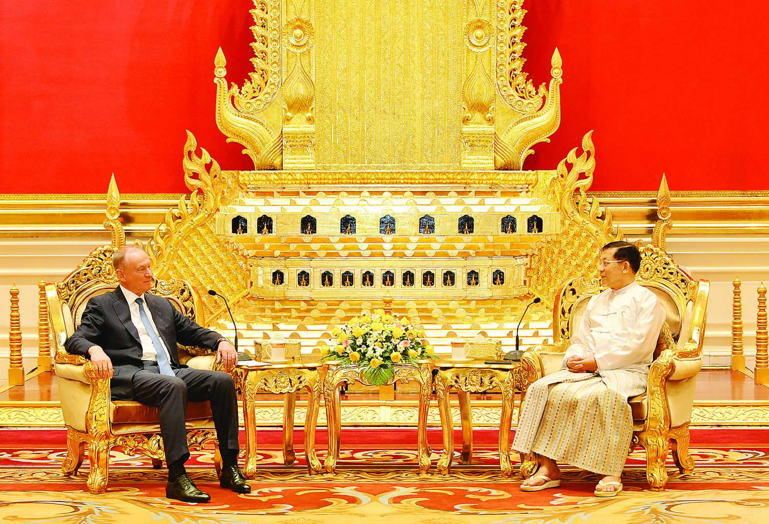 ရုရှားဖက်ဒရေးရှင်းနိုင်ငံသမ္မတ မစ္စတာဗလာဒီမာပူတင်က ချီးမြှင့်အပ်နှင်းသည့် Order of Alexander Nevsky ဘွဲ့တံဆိပ်အား နိုင်ငံတော်စီမံအုပ်ချုပ်ရေးကောင်စီဥက္ကဋ္ဌ နိုင်ငံတော်ဝန်ကြီးချုပ် ဗိုလ်ချုပ်မှူးကြီး မင်းအောင်လှိုင်ထံ ရုရှားဖက်ဒရေးရှင်းနိုင်ငံ၊ လုံခြုံရေးကောင်စီအတွင်းရေးမှူး Mr. Nikolai PATRUSHEV ယနေ့မွန်းလွဲပိုင်းတွင် နေပြည်တော်ရှိ နိုင်ငံတော်စီမံအုပ်ချုပ်ရေးကောင်စီဥက္ကဋ္ဌရုံး သံတမန်ဆောင်ဧည့်ခန်းမ၌ လာရောက်တွေ့ဆုံအပ်နှင်းပြီး နှစ်နိုင်ငံပူးပေါင်းဆောင်ရွက်မှုကဏ္ဍတိုးမြှင့်ရေးအတွက် ဆွေးနွေးသည်။