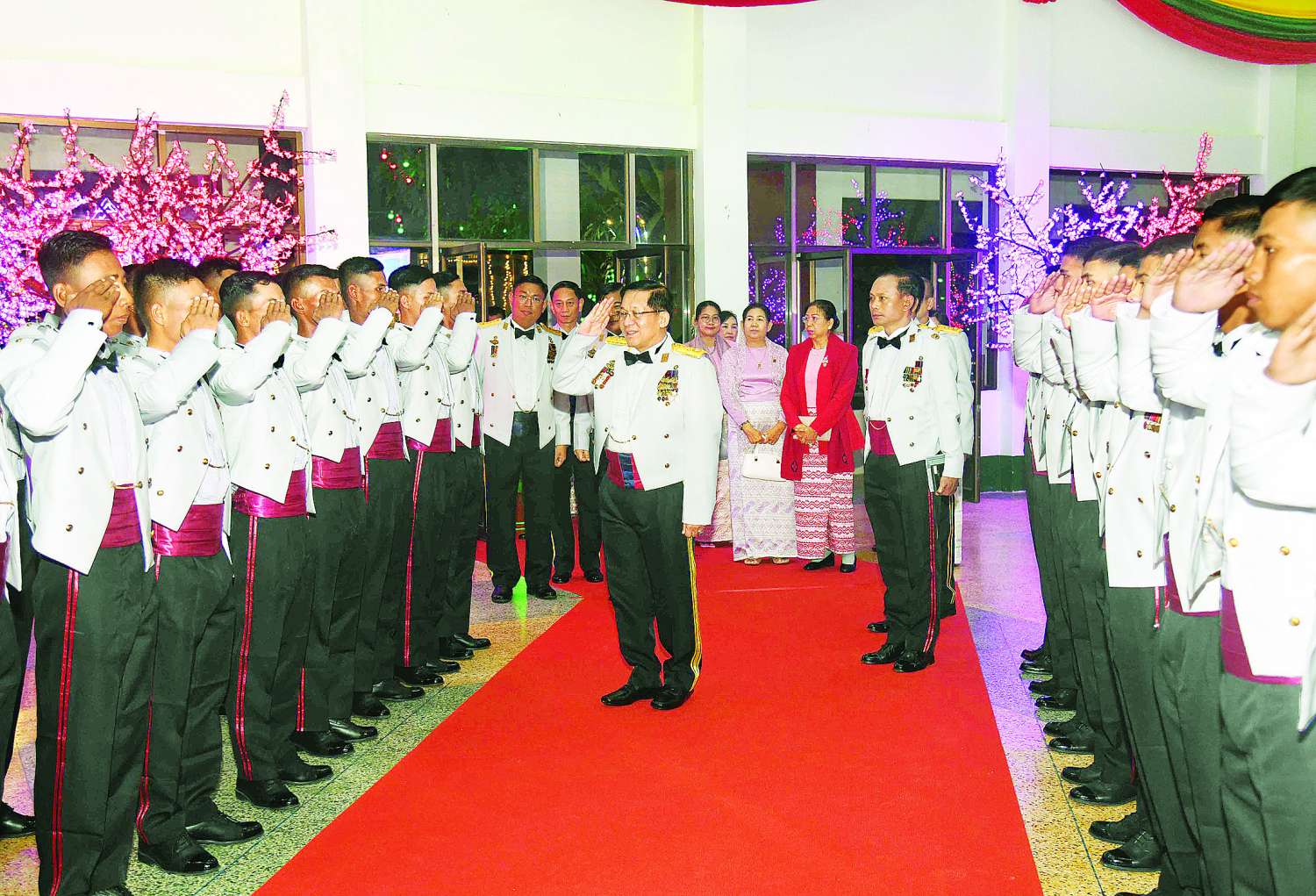 ဦးစွာ နိုင်ငံတော်စီမံအုပ်ချုပ်ရေးကောင်စီဥက္ကဋ္ဌ တပ်မတော်ကာကွယ်ရေးဦးစီးချုပ်က သင်တန်းဆင်းအရာရှိများအား တစ်ဦးချင်းရင်းရင်းနှီးနှီး လိုက်လံနှုတ်ဆက်သည်။ ထို့နောက် နိုင်ငံတော်စီမံအုပ်ချုပ်ရေးကောင်စီဥက္ကဋ္ဌ တပ်မတော်ကာကွယ်ရေးဦးစီးချုပ်နှင့် အဖွဲ့ဝင်များသည် သင်တန်းဆင်းအရာရှိများ၊ ညစာစားပွဲ တက်ရောက်လာကြသူများနှင့်အတူ ဂုဏ်ပြုညစာကို အတူတကွ သုံးဆောင်ကြသည်။