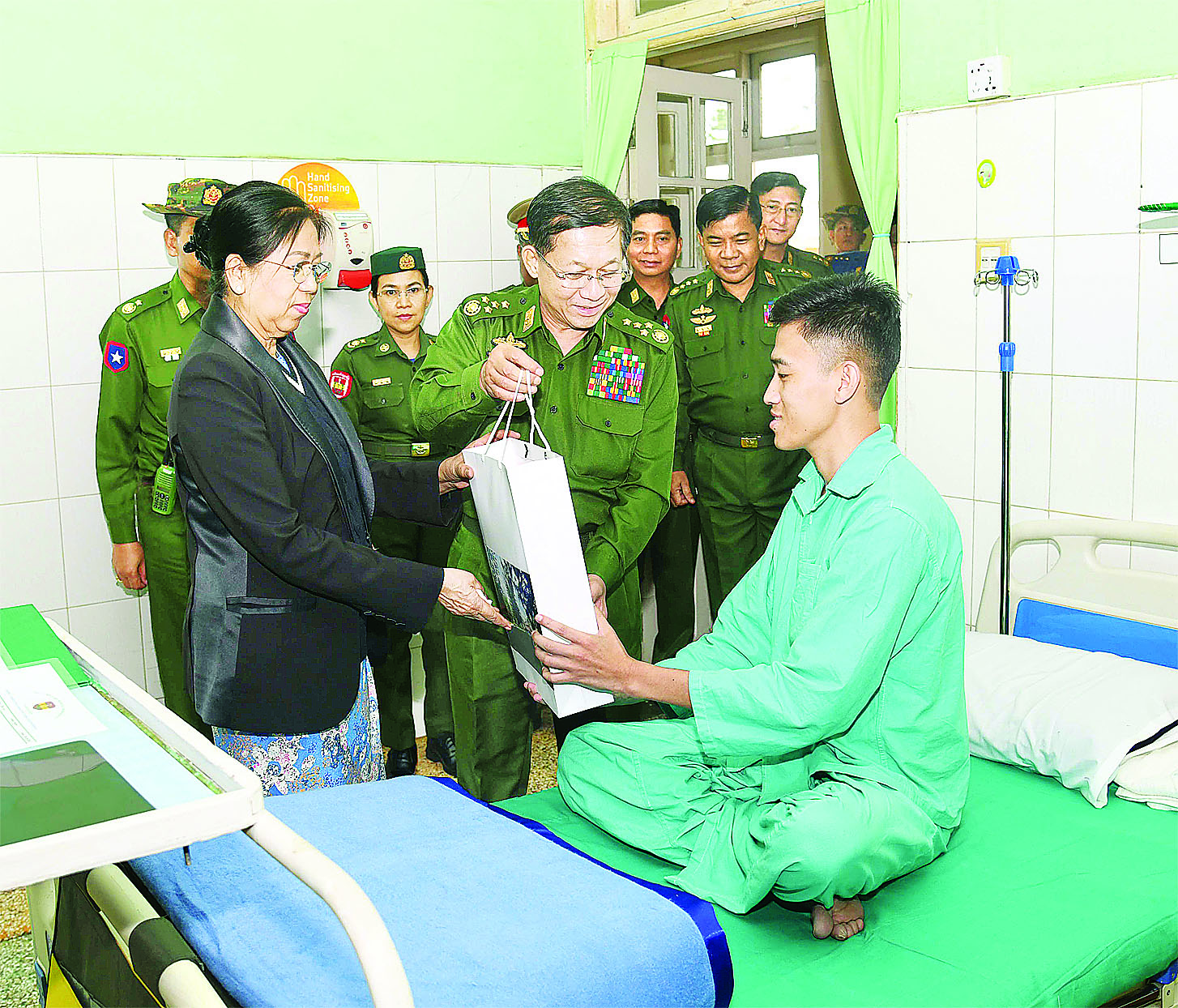 ယင်းနောက် နိုင်ငံတော်စီမံအုပ်ချုပ်ရေးကောင်စီဥက္ကဋ္ဌ တပ်မတော်ကာကွယ်ရေးဦးစီးချုပ်နှင့်ဇနီး၊ အဖွဲ့ဝင်များသည် ဆေးရုံတက်ရောက်ကုသမှု ခံယူလျက်ရှိသည့် အရာရှိ၊ စစ်သည်များအား ဂုဏ်ပြု ချီးမြှင့်ငွေနှင့် လက်ဆောင်ပစ္စည်းများ ပေးအပ်သည်။