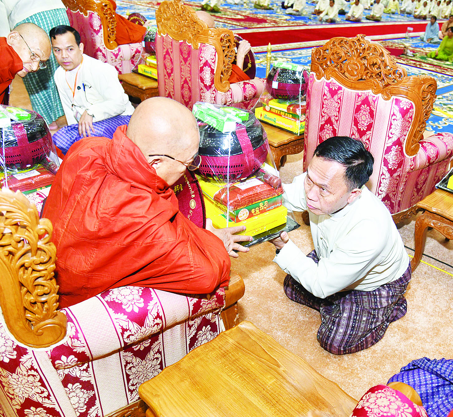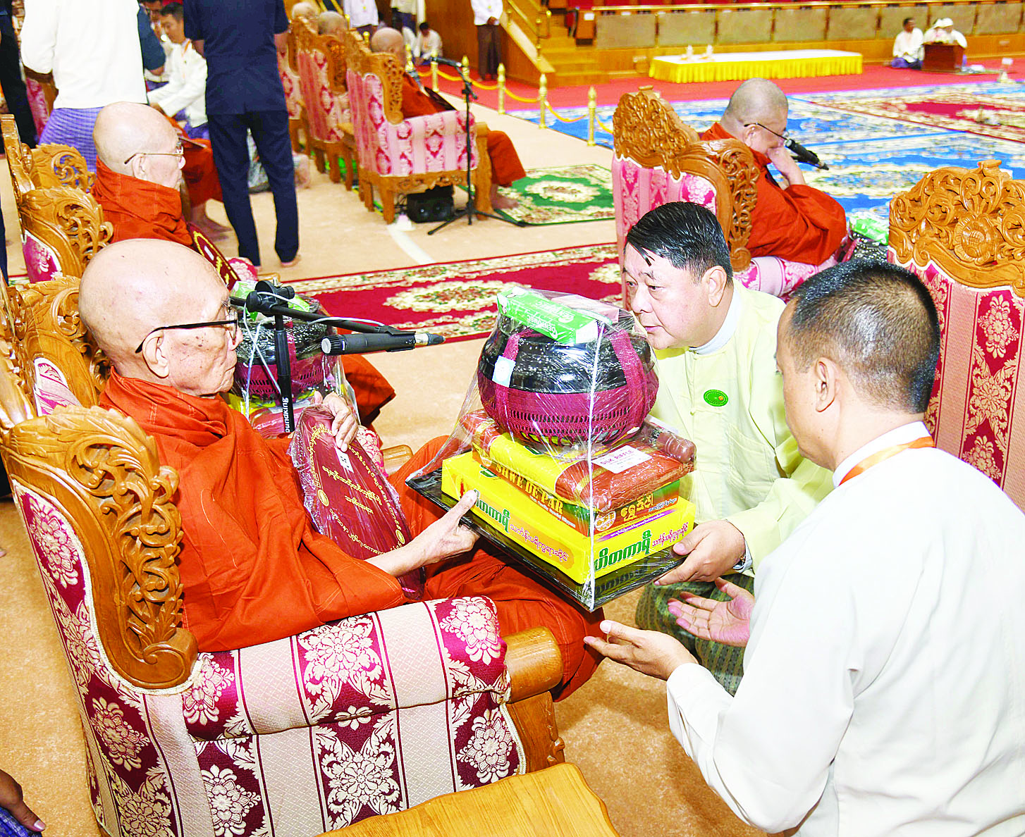 ယင်းနောက် နိုင်ငံတော်စီမံအုပ်ချုပ်ရေးကောင်စီဥက္ကဋ္ဌ နိုင်ငံတော်ဝန်ကြီးချုပ်နှင့် ဇနီးတို့က နိုင်ငံတော်သံဃမဟာနာယက အဖွဲ့ဥက္ကဋ္ဌ သန်လျင်မင်းကျောင်းဆရာတော် ဘုရားကြီးထံသို့လည်းကောင်း၊ ကောင်စီဒုတိယဥက္ကဋ္ဌ ဒုတိယဝန်ကြီးချုပ်နှင့် ဇနီးတို့က နိုင်ငံတော်သံဃမဟာ နာယကအဖွဲ့ အကျိုးတော်ဆောင်၊ မန္တလေးမြို့၊ မစိုးရိမ်တိုက်သစ် မဟာနာယက ဆရာတော်ကြီးထံသို့လည်းကောင်း၊ ကောင်စီ အတွင်းရေးမှူးနှင့် ဇနီး၊ တွဲဖက်အတွင်းရေးမှူးနှင့် ဇနီး၊ ကောင်စီအဖွဲ့ဝင်များနှင့်ဇနီးများ၊ အခမ်းအနားသို့ တက်ရောက်လာသည့် အကြီးအကဲများက သာသနာတော်ဆိုင်ရာ ဘွဲ့တံဆိပ်တော်ဆက်ကပ်ခံယူမည့် ဆရာတော်ကြီးများထံသို့လည်းကောင်း လှူဖွယ်ဝတ္ထုပစ္စည်းများကို ဆက်ကပ်လှူဒါန်းကြသည်။