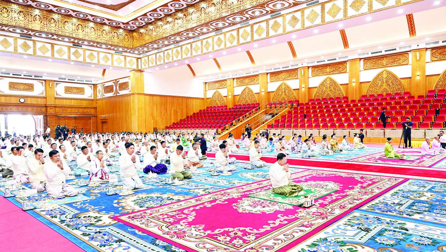 ထို့နောက် အခမ်းအနားကို “နမောတဿ” သုံးကြိမ်ရွတ်ဆို ဘုရားကန်တော့ ဖွင့်လှစ်၍ နိုင်ငံတော်စီမံအုပ်ချုပ်ရေးကောင်စီဥက္ကဋ္ဌ နိုင်ငံတော်ဝန်ကြီးချုပ်နှင့် ဇနီး အမှူးပြုသော ဧည့်ပရိသတ်များက နိုင်ငံတော်သံဃမဟာ နာယကအဖွဲ့ဥက္ကဋ္ဌ သန်လျင် မင်းကျောင်းဆရာတော် ဘုရားကြီးထံမှ ငါးပါးသီလခံယူ ဆောက်တည်ကြပြီး သံဃာတော်အရှင်သူမြတ်များ ရွတ်ပွားသရဇ္ဈာယ်တော်မူသော မေတ္တသုတ် ပရိတ်တရားတော်များကို နာယူကြည်ညိုကြသည်။