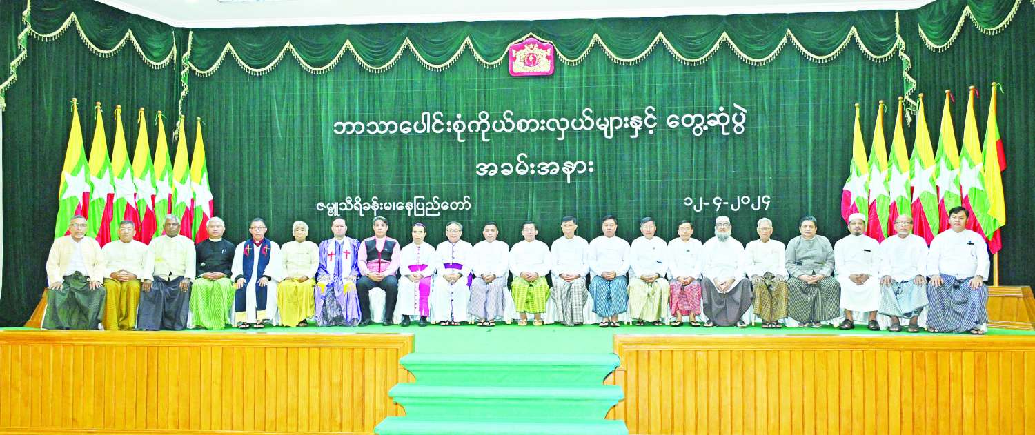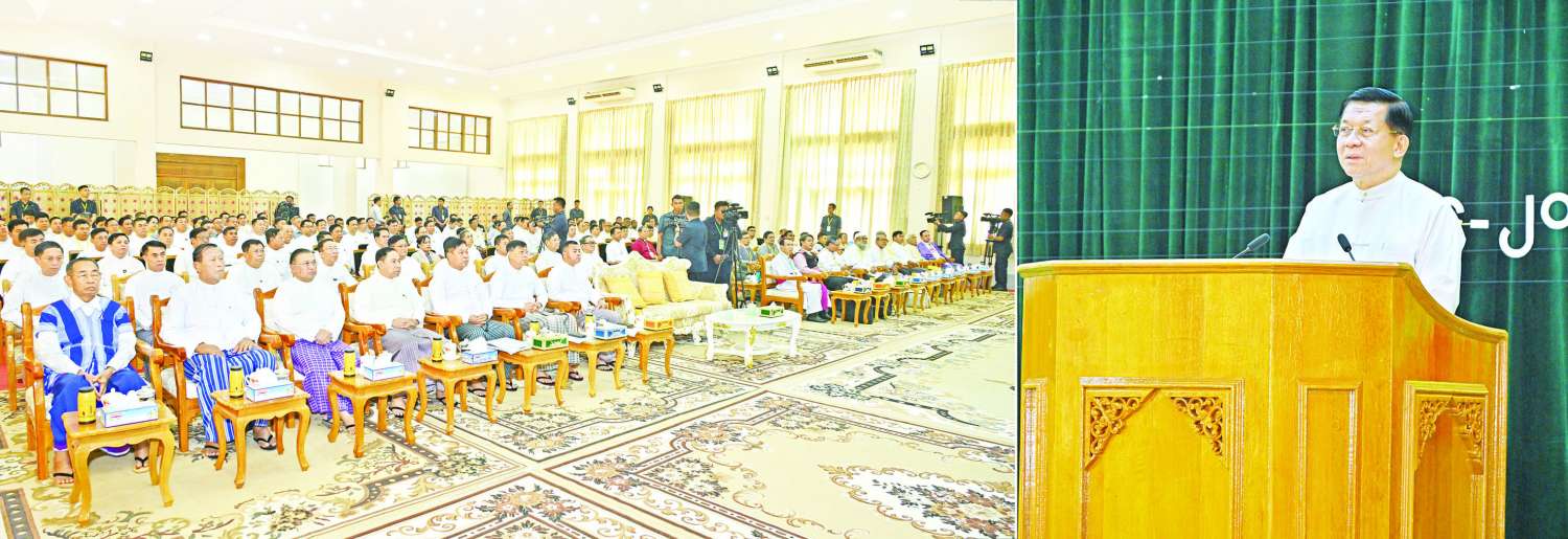ဘာသာပေါင်းစုံကိုယ်စားလှယ်များနှင့် တွေ့ဆုံပွဲအခမ်းအနားကို ယနေ့နံနက်ပိုင်းတွင် နေပြည်တော်ကောင်စီနယ်မြေရှိ ဇမ္ဗူသီရိခန်းမ၌ ကျင်းပပြုလုပ်ရာ နိုင်ငံတော်စီမံအုပ်ချုပ်ရေးကောင်စီဥက္ကဋ္ဌ နိုင်ငံတော်ဝန်ကြီးချုပ် ဗိုလ်ချုပ်မှူးကြီး မင်းအောင်လှိုင် တက်ရောက်အမှာစကားပြောကြားသည်။