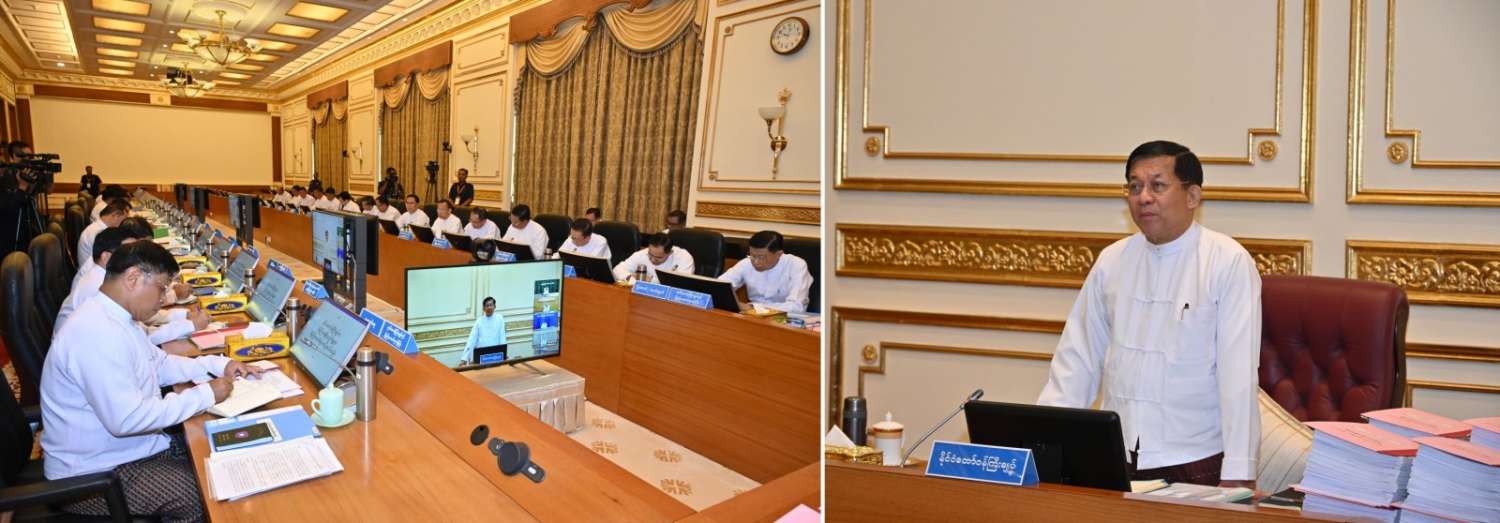 ပြည်ထောင်စုအစိုးရအဖွဲ့အစည်းအဝေး အမှတ်စဉ် (၅/၂၀၂၄) ကို ယနေ့နံနက်ပိုင်းတွင် နေပြည်တော်ရှိ နိုင်ငံတော်စီမံအုပ်ချုပ်ရေးကောင်စီဥက္ကဋ္ဌရုံး အစည်းအဝေးခန်းမ၌ ကျင်းပရာ နိုင်ငံတော်စီမံအုပ်ချုပ်ရေးကောင်စီဥက္ကဋ္ဌ နိုင်ငံတော်ဝန်ကြီးချုပ် ဗိုလ်ချုပ်မှူးကြီး မင်းအောင်လှိုင် တက်ရောက်အမှာစကားပြောကြားသည်။