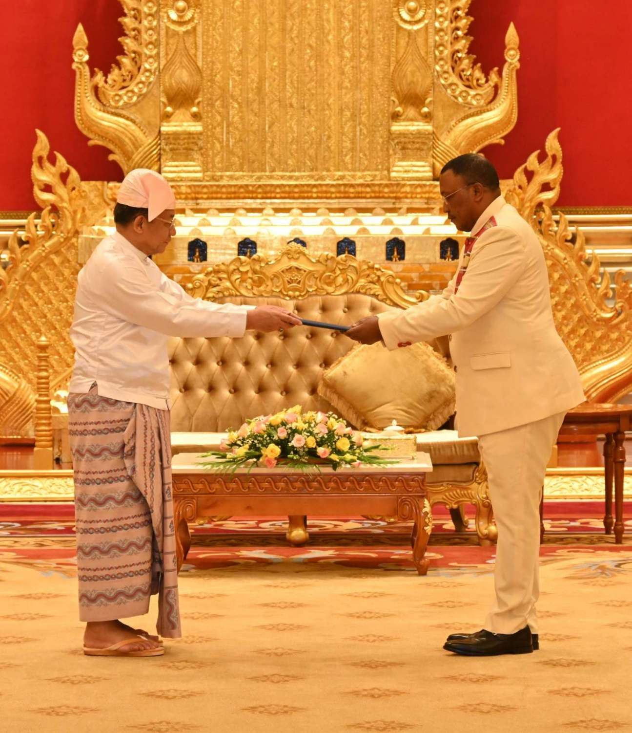 နိုင်ငံတော်စီမံအုပ်ချုပ်ရေးကောင်စီဥက္ကဋ္ဌ နိုင်ငံတော်ဝန်ကြီးချုပ် ဗိုလ်ချုပ်မှူးကြီး မင်းအောင်လှိုင်ထံ မြန်မာနိုင်ငံဆိုင်ရာ အီသီယိုပီးယားဖက်ဒရယ်ဒီမိုကရက်တစ်သမ္မတနိုင်ငံသံအမတ်ကြီး သံအမတ်ခန့်အပ်လွှာ ပေးအပ်