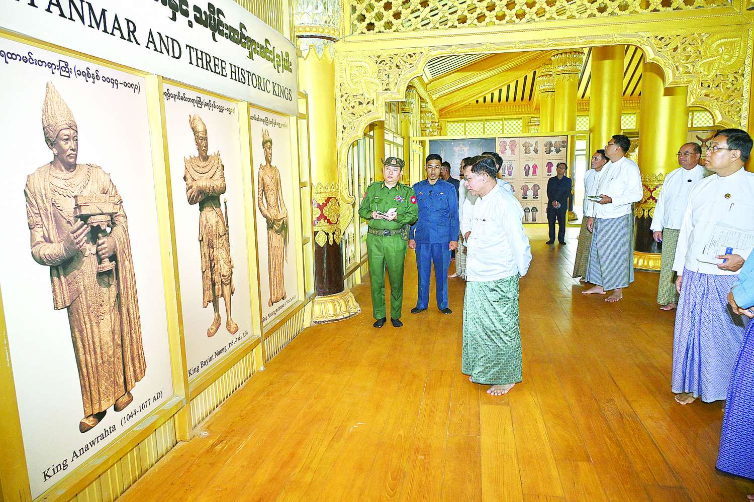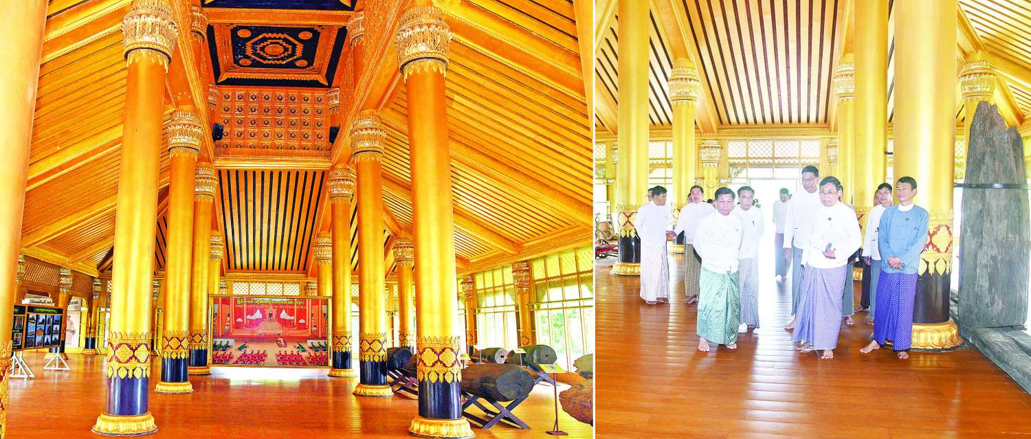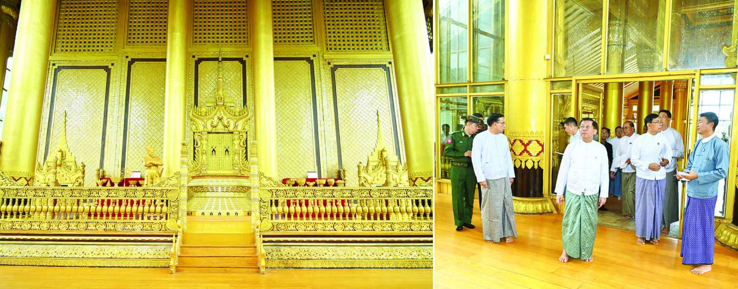 ယင်းနောက် နိုင်ငံတော်စီမံအုပ်ချုပ်ရေးကောင်စီဥက္ကဋ္ဌ နိုင်ငံတော်ဝန်ကြီးချုပ်နှင့် အဖွဲ့ဝင်များသည် ပဲခူးမြို့၊ ကမ္ဘောဇသာဒီရွှေနန်းတော်သို့ ရောက်ရှိကြပြီး ရွှေနန်းတော်အတွင်း ယခင်မြေနန်းပြသာဒ်ဆောင်နေရာမှ တူးဖော်ရရှိသည့် ကျွန်းတိုင်များကို ပြသထားရှိမှု၊ နန်းတော်အတွင်း ပြုပြင်ထိန်းသိမ်းခြင်းလုပ်ငန်းများ ဆောင်ရွက်လျက်ရှိမှုအခြေအနေများနှင့် နန်းတော်အတွင်းလှည့်လည်ကြည့်ရှုစစ်ဆေးပြီး တာဝန်ရှိသူများ၏ တင်ပြချက်များအပေါ် ပြုပြင်ထိန်းသိမ်းခြင်းလုပ်ငန်းများကို ဆောင်ရွက်ရာတွင် အဆင့်ဆင့် အသေးစိတ်ပြင်ဆင်ဆောင်ရွက်သွားရန်လိုကြောင်း၊ နန်းတော်အတွင်း အမြဲသန့်ရှင်းသပ်ရပ်စေရေး ဆောင်ရွက်နေရန်လိုကြောင်း၊ ရှေးခေတ်အသုံးအဆောင်ပစ္စည်းများအား ပျက်စီးမှုမရှိစေရေး ထိန်းသိမ်းပြသထားရန်လိုကြောင်း၊ နန်းတော်ဝန်းအတွင်း လမ်းများကောင်းမွန်အောင် ပြုပြင်ထိန်းခြင်းလုပ်ငန်းများကိုလည်း ဆောင်ရွက်ရန်လိုကြောင်း၊ ရေဝပ်ဧရိယာများ မရှိစေရေးဆောင်ရွက်ရန်နှင့် ရေနုတ်မြောင်းများ တူးဖော်ခြင်းလုပ်ငန်းများကို ဆောင်ရွက်သွားရန်လိုကြောင်း၊ နန်းတော်ကြီး ရေရှည်တည်တံ့နေစေရေး ပြုပြင်ထိန်းသိမ်းခြင်းလုပ်ငန်းများကို စနစ်တကျဖြင့် ဆောင်ရွက်သွားရန်လိုကြောင်းဖြင့် မှာကြားသည်။