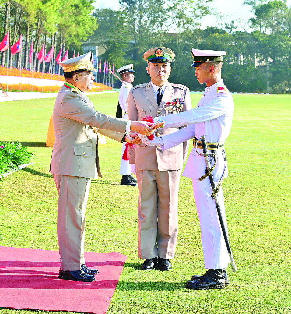 စစ်တက္ကသိုလ် ဗိုလ်လောင်းသင်တန်းအမှတ်စဉ်(၆၆) သင်တန်းဆင်းဂုဏ်ပြု စစ်ရေးပြအခမ်းအနားကို ယနေ့နံနက်ပိုင်းတွင် ပြင်ဦးလွင်မြို့၊ စစ်တက္ကသိုလ်စစ်ရေးပြကွင်း၌ ကျင်းပပြုလုပ်ရာ နိုင်ငံတော်စီမံအုပ်ချုပ်ရေးကောင်စီဥက္ကဋ္ဌ တပ်မတော်ကာကွယ်ရေးဦးစီးချုပ် ဗိုလ်ချုပ်မှူးကြီး သတိုးမဟာသရေစည်သူ သတိုးသီရိသုဓမ္မ မင်းအောင်လှိုင် တက်ရောက်မိန့်ခွန်း ပြောကြားသည်။