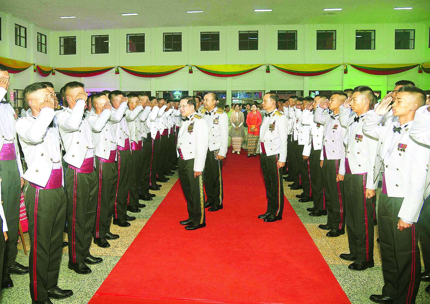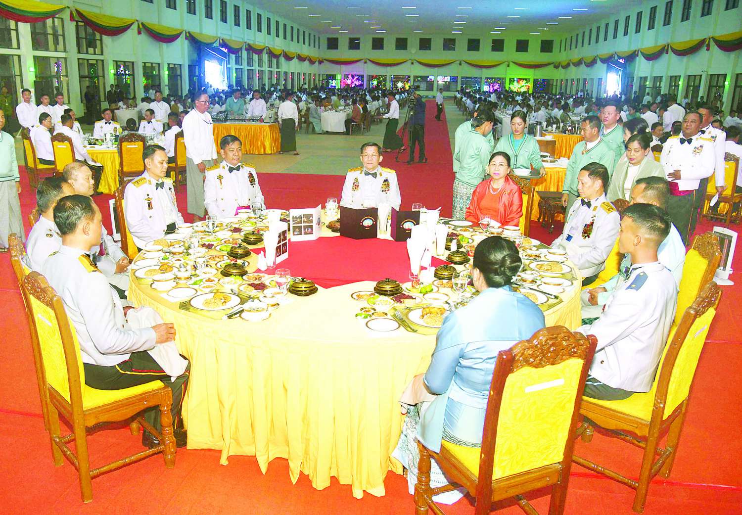 ဦးစွာ နိုင်ငံတော်စီမံအုပ်ချုပ်ရေးကောင်စီဥက္ကဋ္ဌ တပ်မတော်ကာကွယ်ရေးဦးစီးချုပ်က သင်တန်းဆင်းအရာရှိများအား တစ်ဦးချင်း ရင်းရင်းနှီးနှီး လိုက်လံနှုတ်ဆက်သည်။ ထို့နောက် နိုင်ငံတော်စီမံအုပ်ချုပ်ရေးကောင်စီဥက္ကဋ္ဌ တပ်မတော်ကာကွယ်ရေးဦးစီးချုပ်နှင့် အဖွဲ့ဝင်များသည် သင်တန်းဆင်းအရာရှိများ၊ ညစာစားပွဲတက်ရောက်လာကြသူများနှင့်အတူ ဂုဏ်ပြုညစာကို အတူတကွသုံးဆောင်ကြသည်။
