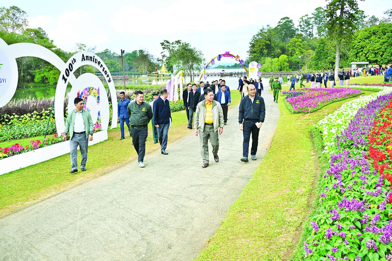 ယင်းနောက် နိုင်ငံတော်စီမံအုပ်ချုပ်ရေးကောင်စီဥက္ကဋ္ဌ နိုင်ငံတော်ဝန်ကြီးချုပ်နှင့်ဇနီး၊ အဖွဲ့ဝင်များသည် အမျိုးသားကန်တော်ကြီးဥယျာဉ်သို့ ရောက်ရှိကြပြီး အမျိုးသားကန်တော်ကြီးဥယျာဉ် နှစ်(၁၀၀)ပြည့်အထိမ်းအမှတ် (၁၇)ကြိမ်မြောက် ပန်းပွဲတော်အား စည်ကားသိုက်မြိုက်စွာဖြင့် ကျင်းပပြုလုပ်ထားရှိမှုများအား ကြည့်ရှုအားပေးပြီး အပန်းဖြေလာရောက်ကြသည့် ပြည်သူများအား ရင်းရင်းနှီးနှီးနှုတ်ဆက်သည်။