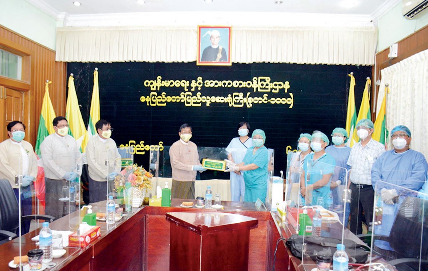 ထို့နောက် စိုက်ပျိုးရေး၊ မွေးမြူရေးနှင့် ဆည်မြောင်းဝန်ကြီးဌာန ပြည်ထောင်စုဝန်ကြီးနှင့် ဒုတိယဝန်ကြီး တို့အမှူးပြုသော ဝန်ကြီးဌာန အောက်ရှိ ဦးစီးဌာနများ၊ တက္ကသိုလ်များမှ နိုင်ငံဝန်ထမ်းများ စုပေါင်း ထည့်ဝင် လှူဒါန်းသည့် အလှူငွေကျပ် ၂၉၂၀၀၀၀ဝ ကို ဝန်ကြီးဌာန ဝန်ထမ်း မိသားစုများကိုယ်စား ဒုတိယဝန်ကြီးက ပေးအပ်လှူဒါန်းရာ နေပြည်တော် ပြည်သူ့ ဆေးရုံကြီး (ခုတင်-၁၀၀၀) မှ တာဝန်ရှိသူများ က လက်ခံရယူ၍ ဂုဏ်ပြုမှတ်တမ်းလွှာ ပြန်လည်ပေးအပ်ကာ ကျေးဇူးတင်စကား ပြောကြားသည်။