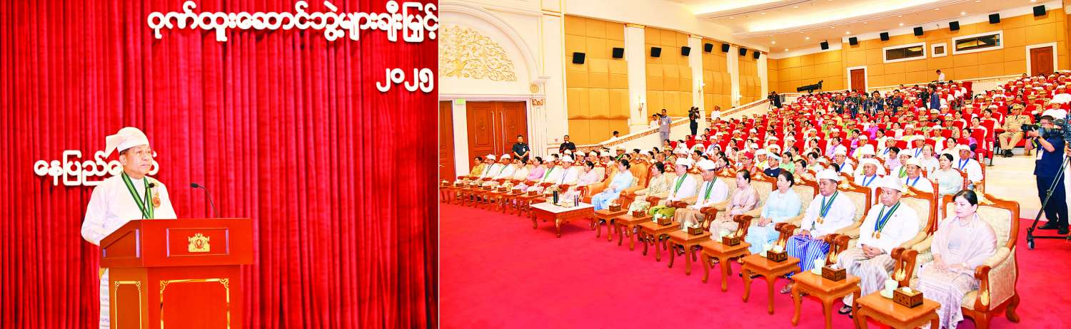 ၂၀၂၅ ခုနှစ်၊ ဂုဏ်ထူးဆောင်ဘွဲ့များ ချီးမြှင့်အပ်နှင်းခြင်းအခမ်းအနားကို ယနေ့နံနက်ပိုင်းတွင် နိုင်ငံတော်စီမံအုပ်ချုပ်ရေးကောင်စီဥက္ကဋ္ဌရုံး၊ သဘင်ဆောင်၌ကျင်းပရာ နိုင်ငံတော်စီမံအုပ်ချုပ်ရေးကောင်စီဥက္ကဋ္ဌ နိုင်ငံတော်ဝန်ကြီးချုပ် ဗိုလ်ချုပ်မှူးကြီး သတိုးမဟာသရေစည်သူ သတိုးသီရိသုဓမ္မမင်းအောင်လှိုင် တက်ရောက်အမှာစကားပြောကြားပြီး ဂုဏ်ထူးဆောင်ဘွဲ့များချီးမြှင့်အပ်နှင်းသည်။