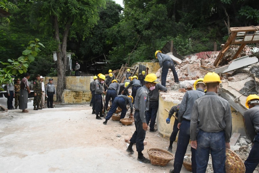ဆက်လက်၍ ချမ်းမြသာစည်မြို့နယ်၊ ကျွန်းလုံးဥသျှောင်ရပ်ကွက်ရှိ မဟာမုနိဘုရားကြီး ဘဏ္ဍာတော်ပိုင် တိုက်တန်းနှင့် ချမ်းအေးသာစံမြို့နယ်၊ စိတ္တရမဟီရပ်ကွက်များသို့ရောက်ရှိပြီး ငလျင်ဒဏ်ကြောင့် ပြိုကျပျက်စီးခဲ့သည့် အန္တရာယ်ရှိအဆောက်အအုံများအား စက်ယန္တရားကြီးများအသုံးပြု၍ ဖယ်ရှားရှင်းလင်းဆောင်ရွက်နေမှုများအား ကြည့်ရှုစစ်ဆေးပြီး လုပ်ငန်းများအမြန်ဆုံးပြီးစီးအောင် ဆောင်ရွက်နိုင်ရေး၊ နေ့စဉ်အများပြည်သူအသုံးပြုမှုများသည့် လမ်းမကြီးများဖြစ်သည့်အတွက် လမ်းပိတ်ဆို့မှုမဖြစ်စေရေးနှင့် အန္တရာယ်ကင်းစွာသွားလာနိုင်ရေးတို့အား မှာကြားပြီး တာဝန်ရှိသူများ၏ တင်ပြချက်များအပေါ် လိုအပ်သည်များ ပေါင်းစပ်ညှိနှိုင်းဆောင်ရွက်ပေးခဲ့ကြောင်း သတင်းရရှိသည်။