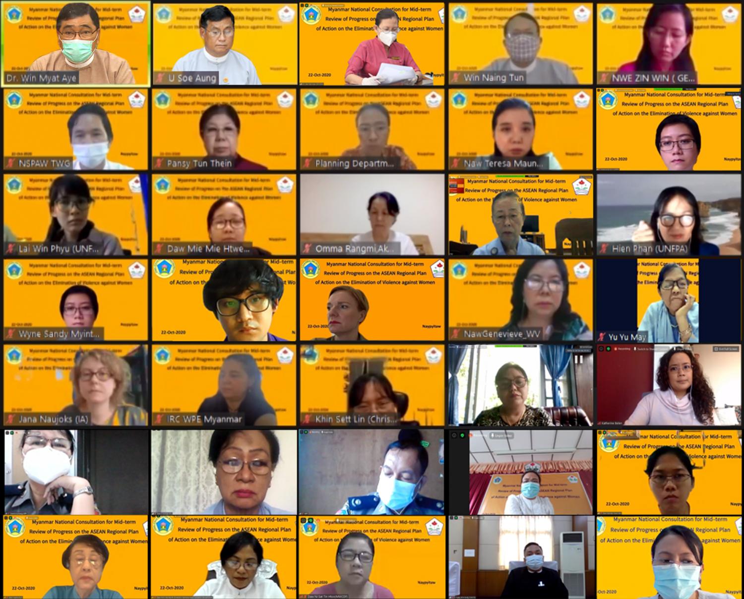 လူမှုဝန်ထမ်း၊ ကယ်ဆယ်ရေးနှင့် ပြန်လည်နေရာချထားရေးဝန်ကြီးဌာနမှ ဦးဆောင်၍ အာဆီယံ ဒေသဆိုင်ရာအမျိုးသမီးများ အပေါ် အကြမ်းဖက်မှုပပျောက်ရေး လုပ်ငန်းစီမံချက်အပေါ် ကာလလတ်ပြန် လည်သုံးသပ်သည့် နိုင်ငံအဆင့်ဆွေးနွေးပွဲကို အောက်တိုဘာ ၂၂ ရက်တွင် Online စနစ်ဖြင့် ကျင်းပသည်။