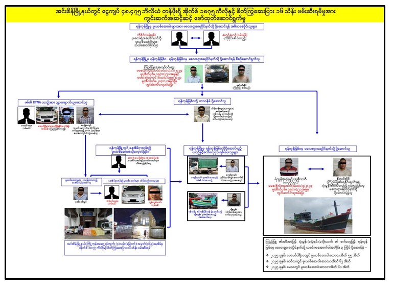ယင်းနေ့ ညနေ ၄ နာရီခွဲအချိန်တွင် စိတ်ပြောင်းဆေးဝါးများအား ပင်လယ်ရေကြောင်းဖြင့် မလေးရှား ရေပိုင်နက်သို့ပို့ဆောင်သူ စိုးလင်းပိုင်(ခ)လင်းလင်းအား ပြည်မြို့၊ နဝဒေးတံတားတွင်လည်းကောင်း၊ ဇူလိုင်လ ၁၆ ရက်နေ့ နံနက် ၁၀ နာရီခွဲအချိန် ရန်ကုန်မြစ်ဝမှ မလေးရှားရေပိုင်နက်သို့ပို့ဆောင်သူ စက်လှေပိုင်ရှင် ရဲထွန်း(ခ) ပဲ့နင်း(ခ)ဖိုးသာဂိအား ပုသိမ်ကြီးမြို့နယ်တွင်လည်းကောင်း ဖမ်းဆီးရမိခဲ့ပြီး ရဲထွန်းမှာလည်း မူးယစ်အမှုဖြင့် အလိုရှိတရားခံပြေးတစ်ဦးဖြစ်ကြောင်း။