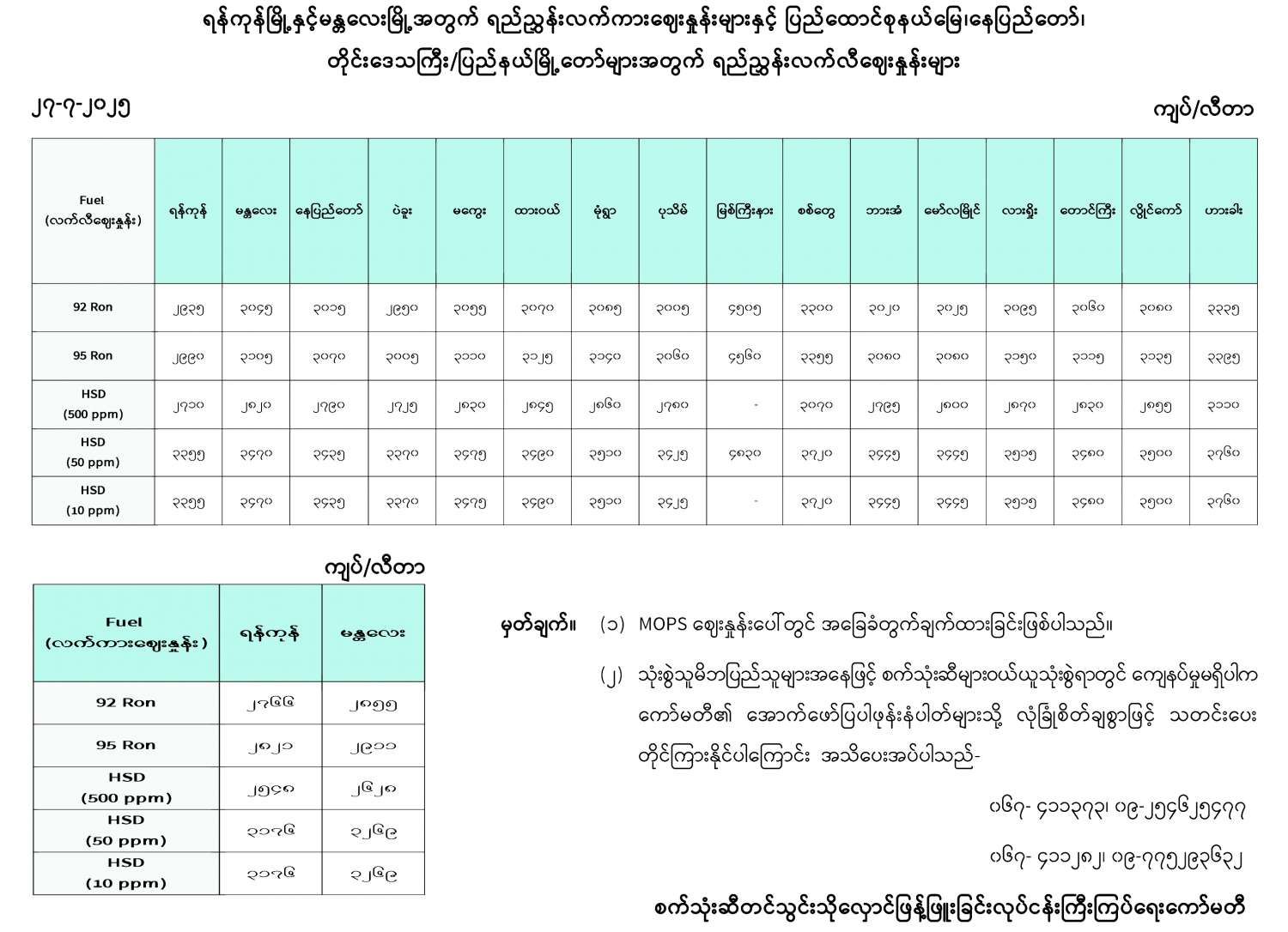 ရန်ကုန်မြို့နှင့် မန္တလေးမြို့အတွက် ရည်ညွှန်းလက်ကားဈေးနှုန်းများနှင့် ပြည်ထောင်စုနယ်မြေ နေပြည်တော်၊ တိုင်းဒေသကြီး/ပြည်နယ် မြို့တော်များအတွက် ရည်ညွှန်းလက်လီဈေးနှုန်းများ 07/27/2025
