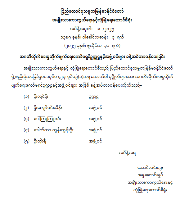 အဂတိလိုက်စားမှုတိုက်ဖျက်ရေးကော်မရှင်ဥက္ကဋ္ဌနှင့် အဖွဲ့ဝင်များ ခန့်အပ်တာဝန်ပေးခြင်း