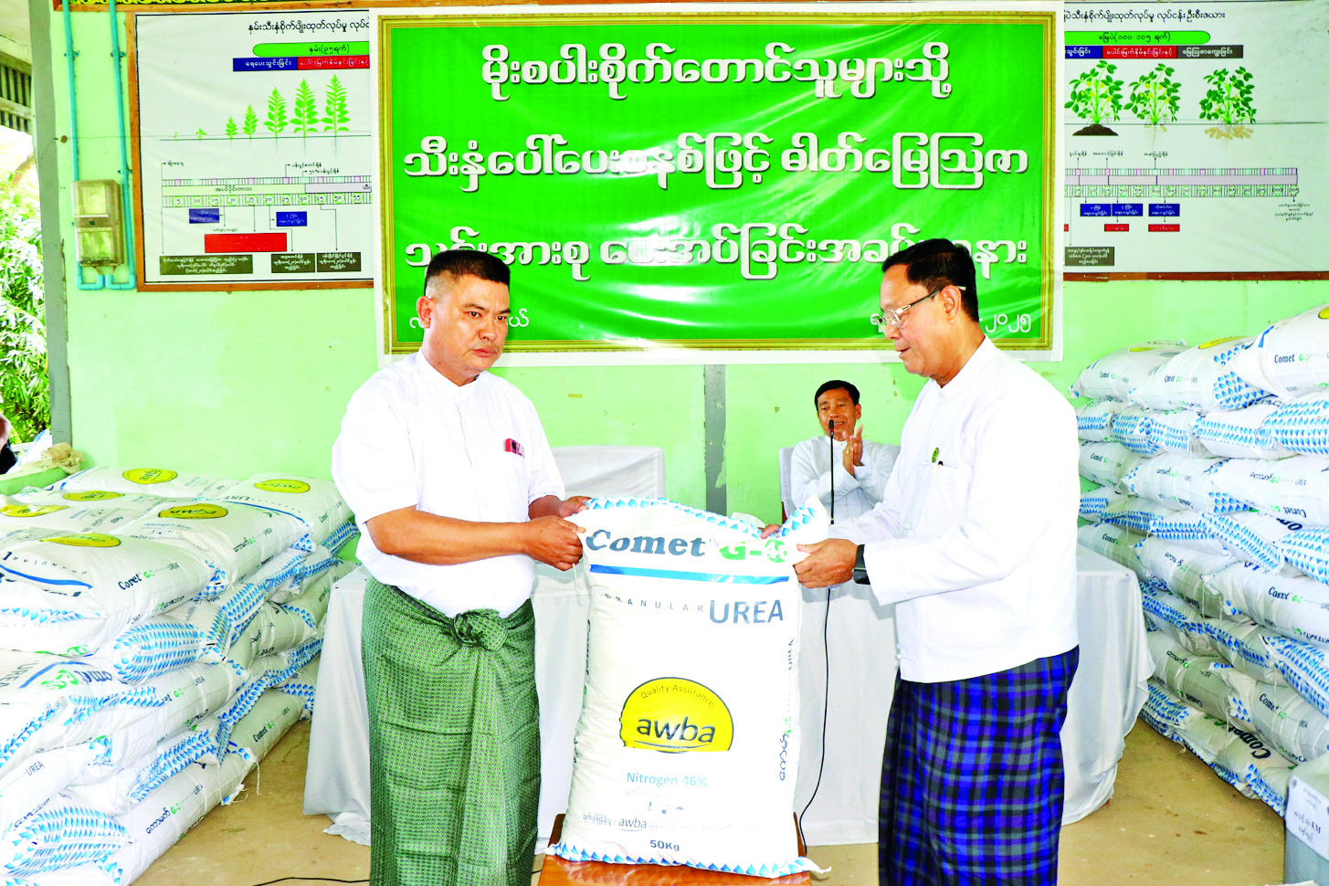 ပြည်ထောင်စုဝန်ကြီး ဦးလှမိုး မိုးစပါးစိုက်တောင်သူများသို့ သီးနှံပေါ်ပေးစနစ်ဖြင့် ဓာတ်မြေဩဇာသွင်းအားစု ပေးအပ်
