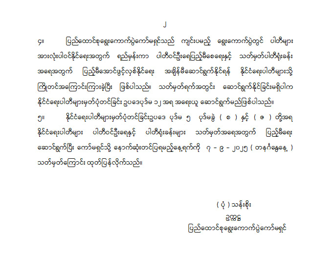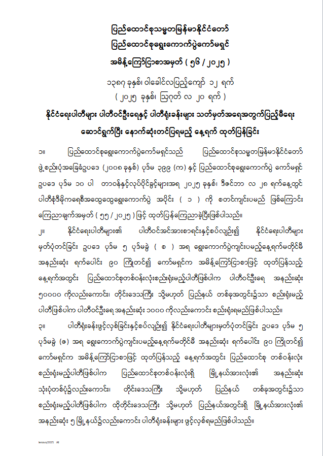 နိုင်ငံရေးပါတီများ ပါတီဝင်ဦးရေနှင့် ပါတီရုံးခန်းများ သတ်မှတ်အရေအတွက်ပြည့်မီရေး ဆောင်ရွက်ပြီး နောက်ဆုံးတင်ပြရမည့် နေ့ရက်ထုတ်ပြန်ခြင်း 08/20/2025