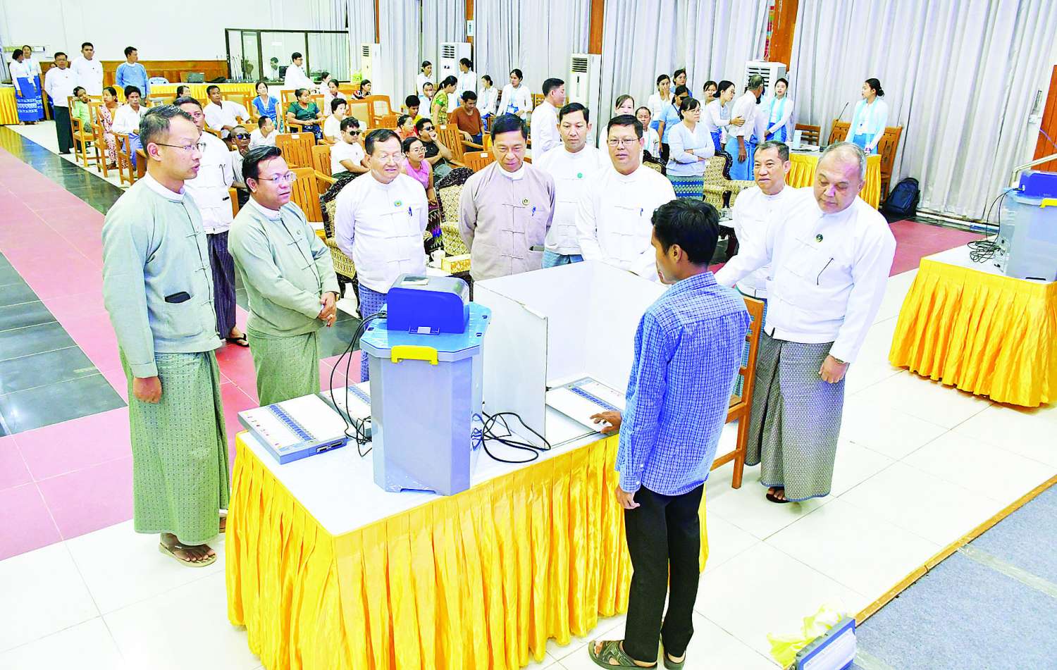 မသန်စွမ်းသူများကိုယ်တိုင် ဆန္ဒမဲပေးနိုင်ရေးအသိပညာပေးခြင်းနှင့် မြန်မာအီလက်ထရောနစ်မဲပေးစက် လက်တွေ့စမ်းသပ်အသုံးပြုခြင်းအစီအစဉ်ကို ယနေ့ နံနက် ၁၀ နာရီတွင် လူမှုဝန်ထမ်း၊ ကယ်ဆယ်ရေးနှင့်ပြန်လည်နေရာချထားရေးဝန်ကြီးဌာန စုပေါင်းအစည်းအဝေးခန်းမ၌ ကျင်းပရာလူမှုဝန်ထမ်း၊ ကယ်ဆယ်ရေးနှင့်ပြန်လည်နေရာချထားရေးဝန်ကြီးဌာန ပြည်ထောင်စုဝန်ကြီး ဒေါက်တာစိုးဝင်း၊ ပြည်ထောင်စုရွေးကောက်ပွဲကော်မရှင်အဖွဲ့ဝင် ဦးအောင်လွင်ဦး၊ လူမှုဝန်ထမ်း၊ ကယ်ဆယ်ရေးနှင့်ပြန်လည်နေရာချထားရေးဝန်ကြီးဌာန ဒုတိယဝန်ကြီး ဒေါက်တာသန်းစိုး၊ နေပြည်တော်ကောင်စီ၊ ကောင်စီဝင် ဦးမြင့်စိုးနှင့် တာဝန်ရှိသူများ၊ မသန်စွမ်းသူကိုယ်စားလှယ်များ တက်ရောက်ကြသည်။