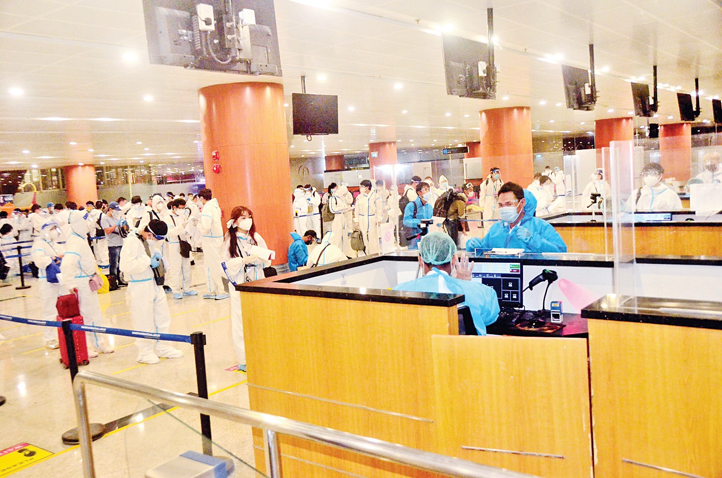 ၎င်းတို့ ရန်ကုန်အပြည်ပြည်ဆိုင်ရာ လေဆိပ်သို့ ရောက်ရှိချိန်တွင်   လူဝင်မှုကြီးကြပ်ရေး၊  ကျန်းမာရေး စစ်ဆေးရေး    သီးသန့်စီစဉ်ပေးသည့် နေရာ/သတ်မှတ် ဟိုတယ်များ၌   အသွားအလာ ကန့်သတ်မှု  ခုနစ်ရက်နှင့် နေအိမ်တွင် အသွားအလာကန့်သတ်မှု ခုနစ်ရက် နေထိုင်စေရေးတို့ကို အလုပ်သမား၊ လူဝင်မှုကြီးကြပ်ရေးနှင့် ပြည်သူ့အင်အားဝန်ကြီးဌာန၊ ကျန်းမာရေးနှင့် အားကစားဝန်ကြီးဌာနနှင့် ရန်ကုန်တိုင်းဒေသကြီး အစိုးရအဖွဲ့တို့မှ သက်ဆိုင်ရာ အခန်းကဏ္ဍအလိုက် တာဝန်ယူ ဆောင်ရွက် ပေးခဲ့ကြသည်။