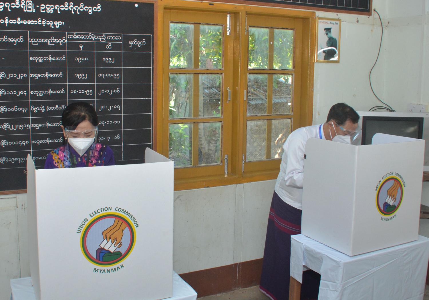ပြည်ထောင်စုတရားသူကြီးချုပ်နှင့်ဇနီး၊ နိုင်ငံတော်ဖွဲ့စည်းပုံအခြေခံဥပဒေဆိုင်ရာ ခုံရုံးဥက္ကဋ္ဌနှင့်ဇနီး၊ ပြည်ထောင်စု ရွေးကောက်ပွဲ ကော်မရှင်ဥက္ကဋ္ဌနှင့်ဇနီးတို့သည် ယနေ့ နံနက် ၉ နာရီခွဲတွင် ဥတ္တရသီရိမြို့နယ် ဥတ္တရသီရိရပ်ကွက် ရွေးကောက်ပွဲကော်မရှင် အဖွဲ့ ခွဲရုံးသို့ လာရောက်ကြပြီး ကိုဗစ်-၁၉ ရောဂါကာကွယ်ထိန်းချုပ်ရေး လမ်းညွှန်ချက်များ နှင့်အညီ ကြိုတင် ဆန္ဒမဲပေးရန် မှတ်တမ်းစာအုပ်၌ လက်မှတ်ရေးထိုးကြသည်။