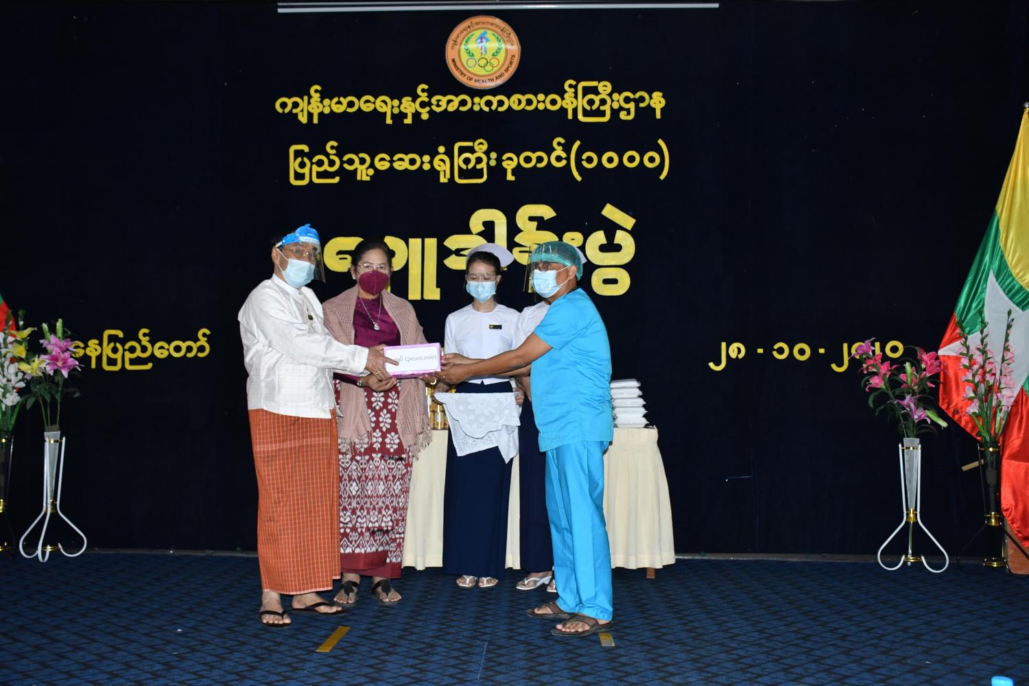 တိုင်းရင်းသားလူမျိုးများရေးရာ ဝန်ကြီးဌာန မိသားစုတို့က ငွေကျပ်သိန်း (၃၀) တန်ဖိုးရှိ ရေခဲသေတ္တာ(၁)လုံးနှင့် လေအေးပေးစက် (၄)လုံးတို့ကို နေပြည်တော် ပြည်သူ့ဆေးရုံကြီး (ခုတင်-၁၀၀၀)ရှိ COVID-19 ICU အခန်းအတွက်နှင့် နေပြည်တော် ပြည်သူ့ဆေးရုံကြီး (ခုတင်-၁၀၀၀)၊ နေပြည်တော် ပြည်သူ့ဆေးရုံကြီး (ခုတင်-၃၀၀)၊ မျက်စိ၊ နား၊ နှာခေါင်း၊ လည်ချောင်း၊ ဦးခေါင်းနှင့် လည်ပင်းခွဲစိတ်အထူးကုဆေးရုံကြီးနှင့် သွားရောဂါအထူးကုဆေးရုံကြီးတို့၌ တာဝန်ထမ်းဆောင် လျက်ရှိသော ကျန်းမာရေးဝန်ထမ်းများနှင့် လူနာများအတွက် စိန်ဟင်္သာ ရိပ်မွန်ကုမ္ပဏီလီမိတက်မှ ထုတ်လုပ်သော ငွေကျပ် (၃၃) သိန်းခန့် တန်ဖိုးရှိ ထမင်းဘူးနှင့် စည်သွပ်ဘူးများ ပေးအပ် လှူဒါန်းခြင်း အခမ်းအနားကို ယမန်နေ့ နံနက်ပိုင်းက နေပြည်တော် ပြည်သူ့ဆေးရုံကြီး (ခုတင်-၁၀၀၀)ရှိ အစည်းအဝေးခ န်းမဆောင်-၂ ၌ ကျင်းပပြုလုပ်သည်။