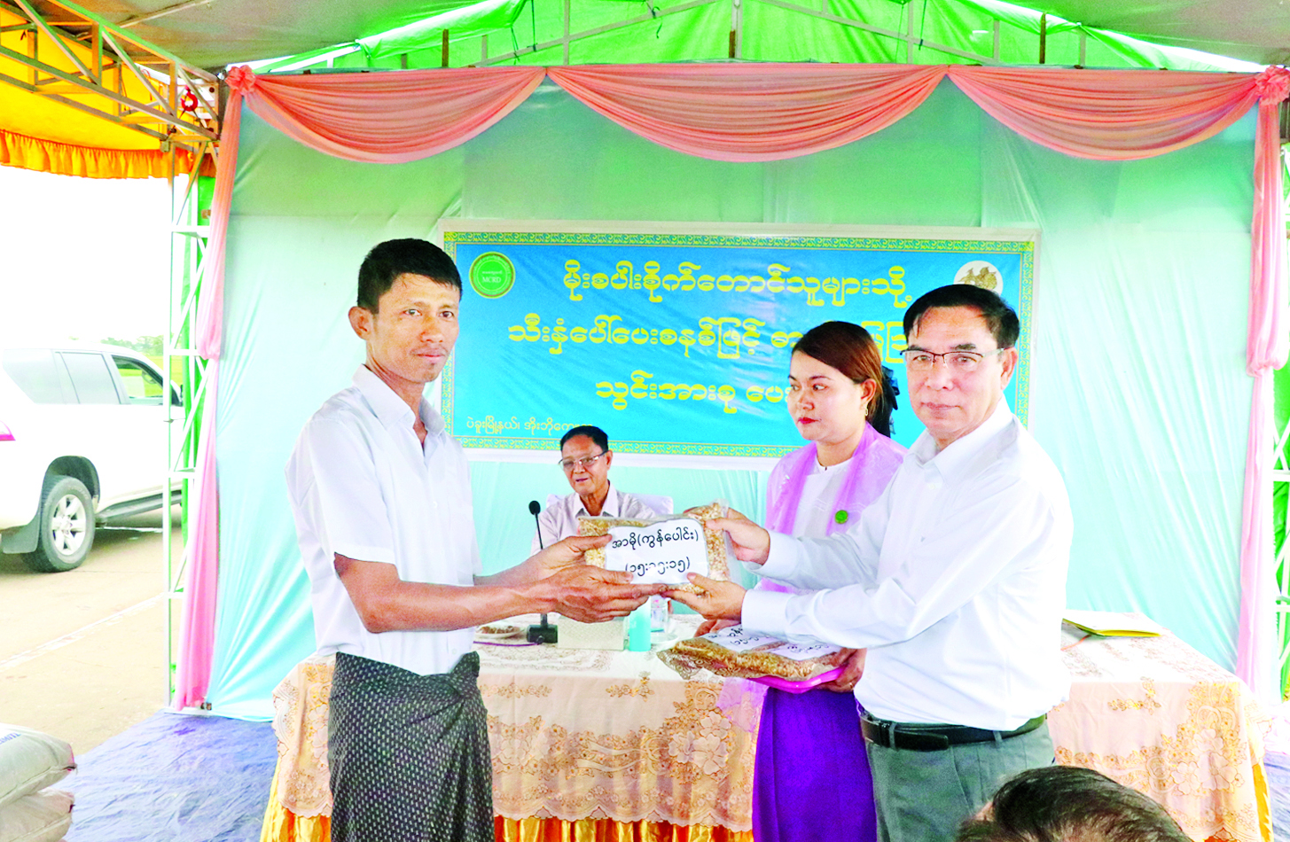 ပြည်ထောင်စုဝန်ကြီး ဦးလှမိုး မိုးစပါးစိုက်တောင်သူများအား သီးနှံပေါ်ပေးစနစ်ဖြင့် ဓာတ်မြေဩဇာသွင်းအားစုပေးအပ်ပွဲ အခမ်းအနားတက်ရောက်