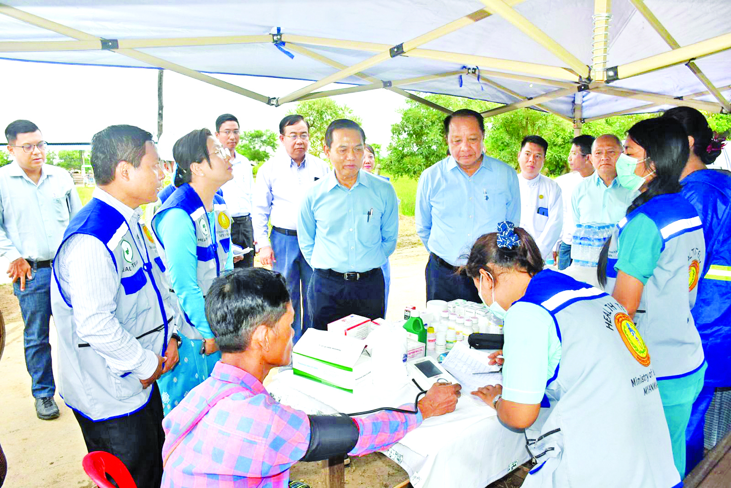 ယင်းနောက် တပ်ကုန်းမြို့နယ် ခုတင် (၁၀၀) ဆံ့ ဆေးရုံသို့ သွားရောက်ပြီး ရေဘေးအန္တရာယ်ကြိုတင်ကာကွယ်ရေး စီမံဆောင်ရွက်ထားရှိမှုများကို ကြည့်ရှုစစ်ဆေးပြီး ဇေယျာသီရိမြို့နယ် ကျည်တောင်ကျေးရွာ ကိုးခမ်းကြီးဘုရားတွင် ဖွင့်လှစ်ထားသည့် ရေဘေးရှောင်စခန်းသို့ သွားရောက်ပြီး ပြည်သူ့ကျန်းမာရေးလုပ်ငန်းများ ဆောင်ရွက်နေမှုနှင့် ယာယီဆေးခန်းဖွင့်လှစ်ကုသပေးမှုများကို ကြည့်ရှုစစ်ဆေးကာ အရေးပေါ်တုံ့ပြန်ရေးအဖွဲ့နှင့် ဆေးကုသရေးအဖွဲ့များ အလှည့်ကျတာဝန်ချထားရေး၊ ဆေးစိမ်ခြင်ထောင်များ ပေးဝေရေး၊ သက်ကြီးဘိုးဘွားများအား သွေးတိုး၊ နှလုံး၊ ဆီးချို ရောဂါများ စစ်ဆေးကုသမှုပေးရေးနှင့် ကူးစက်ရောဂါကာကွယ်ရေးလုပ်ငန်းများကို ဆောင်ရွက်ပေးရန်မှာကြားပြီး ကျန်းမာရေးဝန်ထမ်းများကို ချီးမြှင့်ငွေနှင့် စခန်းတာဝန်ခံအား တွေ့ဆုံ၍ ရေဘေးရှောင်ပြည်သူများအတွက် ကြက်ဥ၊ ဆီ၊ ခေါက်ဆွဲခြောက်၊ ရေသန့်နှင့် ထောက်ပံ့ပစ္စည်းများ ပေးအပ်ခဲ့ကြောင်း သိရသည်။