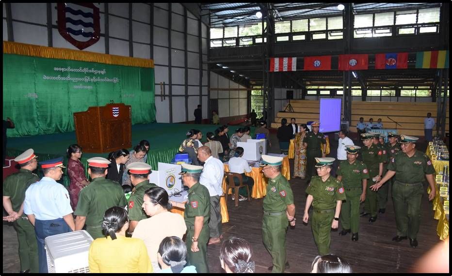 မြန်မာအီလက်ထရောနစ်မဲပေးစက်(MEVM)ဆိုင်ရာ အသိပညာပေးခြင်းနှင် လက်တွေ့စမ်းသပ်မဲပေးခြင်းကို ယနေ့မွန်းလွဲပိုင်းတွင် အနောက်တောင်တိုင်းစစ်ဌာနချုပ် တပ်နယ်အားကစားခန်းမ၌ပြုလုပ်ရာ တိုင်းမှူးဗိုလ်မှူးချုပ် စိုးကျော်ထက်နှင့် အဖွဲ့ဝင်များ၊ အရာရှိ၊ စစ်သည်၊ မိသားစုဝင်များ တက်ရောက်ကြသည်။