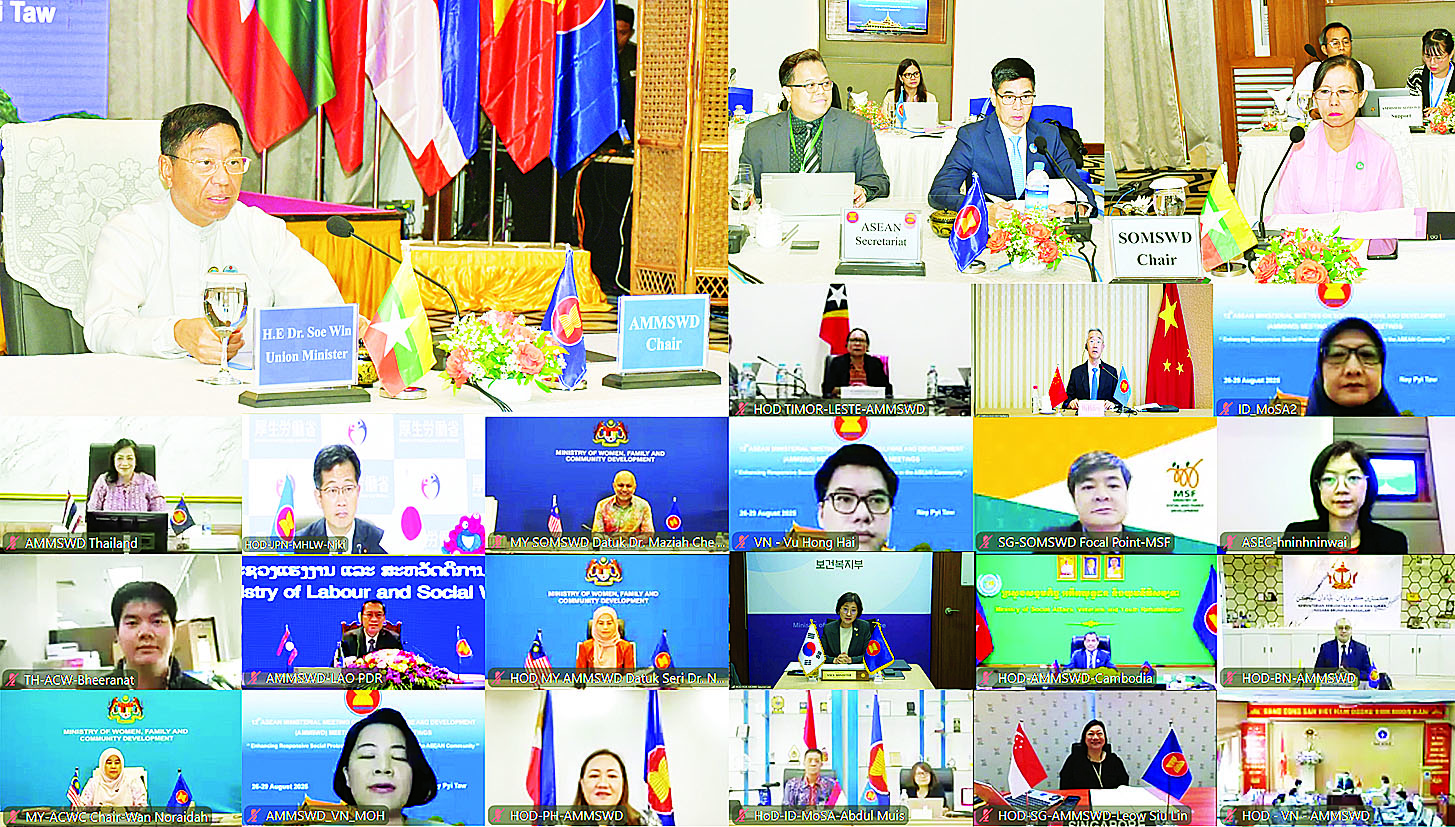မြန်မာနိုင်ငံက အိမ်ရှင်နိုင်ငံအဖြစ် (၁၂) ကြိမ်မြောက် အာဆီယံလူမှုဝန်ထမ်းနှင့် ဖွံ့ဖြိုးတိုးတက်ရေးဆိုင်ရာ ဝန်ကြီးများအဆင့် အစည်းအဝေး (12th ASEAN Ministerial Meeting on Social Welfare and Development- AMMSWD)နှင့် (၈) ကြိမ်မြောက် အာဆီယံ+၃ လူမှုဝန်ထမ်းနှင့် ဖွံ့ဖြိုးတိုးတက်ရေးဆိုင်ရာ ဝန်ကြီးများအဆင့်အစည်းအဝေး (8th ASEAN+3 Ministerial Meeting on Social Welfare and Development- AMMSWD+3) များကို ယနေ့နံနက်ပိုင်းတွင် နေပြည်တော်ရှိ M-Gallery Hotel ၌ Video Conference ဖြင့်ကျင်းပရာ အာဆီယံလူမှုဝန်ထမ်းနှင့် ဖွံ့ဖြိုးတိုးတက်ရေးဆိုင်ရာ ဝန်ကြီးများအဆင့်အစည်းအဝေး အလှည့်ကျဥက္ကဋ္ဌဖြစ်သော လူမှုဝန်ထမ်း၊ ကယ်ဆယ်ရေးနှင့်ပြန်လည်နေရာ ချထားရေးဝန်ကြီးဌာန ပြည်ထောင်စုဝန်ကြီး ဒေါက်တာစိုးဝင်းက ဥက္ကဋ္ဌအဖြစ် ဆောင်ရွက်သည်။