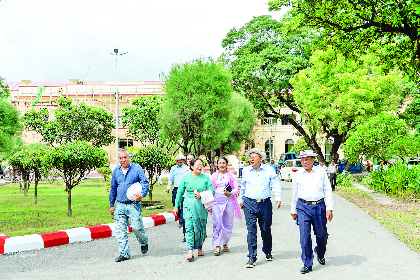 ဆက်လက်၍ မန္တလေးငလျင်ကြောင့်ပျက်စီးသွားသော တက္ကသိုလ်ပင်မဆောင်နှင့်ဘွဲ့နှင်း သဘင်ခန်းမတို့ကို ဆောက်လုပ်ရေးဝန်ကြီးဌာန၏ ကြီးကြပ်မှုဖြင့် မြန်မာမြို့ပြနှင့် အခြေခံအဆောက်အအုံ ဖွံ့ဖြိုးရေးလုပ်ငန်းရှင်များအသင်း(MDA) နှင့် မြန်မာနိုင်ငံဆောက်လုပ်ရေးဆိုင်ရာ လုပ်ငန်းရှင်များအသင်းချုပ်(MCEF)တို့က ပြုပြင်ဆောင်ရွက်နေသော လုပ်ငန်း ခွင်သို့ သွားရောက်ကြည့်ရှုစစ်ဆေး သည်။