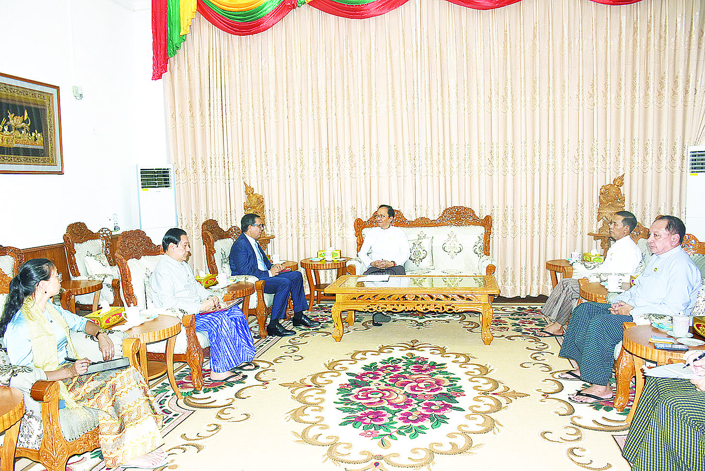 တွေ့ဆုံစဉ် IFRC အဖွဲ့မှ မန္တလေးငလျင်ကြီးကြောင့် ထိခိုက်ခဲ့ရမှုများအား ပြန်လည်ထူထောင်ရေးလုပ်ငန်းများတွင် မြန်မာနိုင်ငံကြက်ခြေနီအသင်းမှတစ်ဆင့် ပံ့ပိုးကူညီနေသည့် ကိစ္စရပ်များ၊ IFRC မှ ပဏာမကျန်းမာရေးစောင့်ရှောက်မှုလုပ်ငန်းများ၊ ရေနှင့်သန့်ရှင်းရေးဆိုင်ရာကိစ္စရပ်များတွင် မြန်မာနိုင်ငံကြက်ခြေနီအသင်းနှင့် ပူးပေါင်းဆောင်ရွက်မည့်ကိစ္စရပ်များ၊ မြန်မာနိုင်ငံကြက်ခြေနီအသင်းမှ ဆောင်ရွက်လျက်ရှိသည့် လူသားချင်းစာနာထောက်ထားမှုအကူအညီ ပေးသည့်ကိစ္စရပ်များတွင် ပံ့ပိုးပေးလျက်ရှိသည့်အခြေအနေများ၊ ကျန်းမာရေးဝန်ကြီးဌာန၊ ပြည်သူ့ကျန်းမာရေးဦးစီးဌာန၊ မြန်မာနိုင်ငံကြက်ခြေနီအသင်းနှင့် IFRC တို့ အကြား ဆက်လက်ပူးပေါင်းဆောင်ရွက်မည့်ကိစ္စရပ်များကို ရင်းနှီးစွာ အမြင်ချင်းဖလှယ် ဆွေးနွေးခဲ့ကြ သည်။