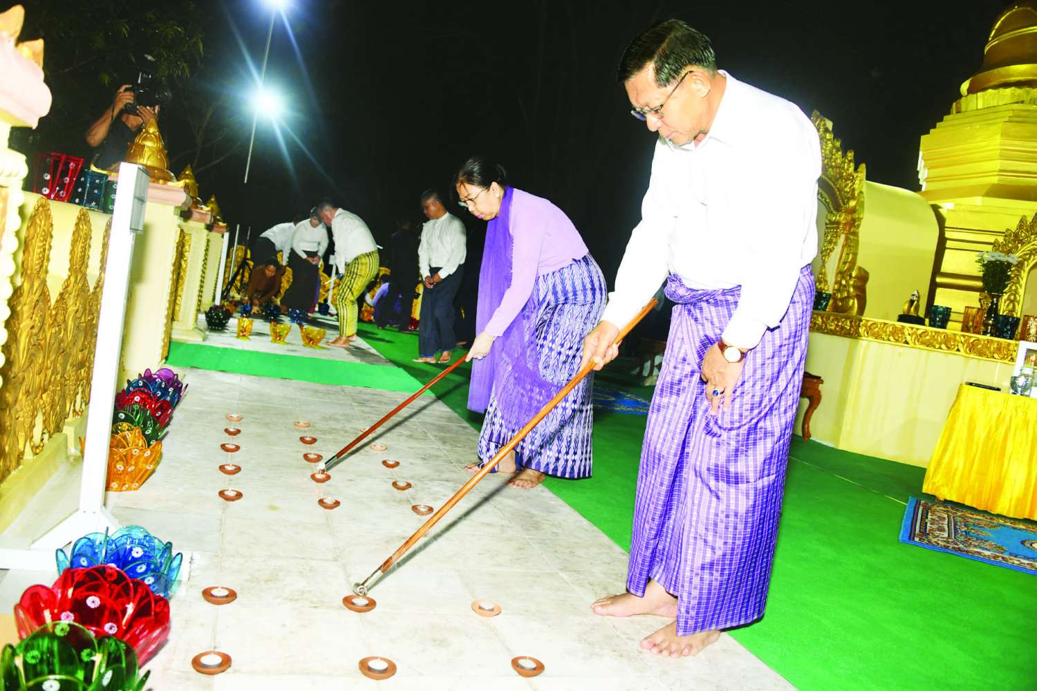 ထိုသို့ မြန်မာ့ယဉ်ကျေးမှုပွဲတော်ကို ထိန်းသိမ်းဆင်နွှဲလျက်ရှိကြရာ နေပြည်တော်ကောင်စီနယ်မြေ၊ ဇေယျာသီရိမြို့နယ်အတွင်းရှိ ရွှေဘုန်းပွင့်စေတီတော်မြတ်ကြီးတွင်လည်း ယနေ့ညပိုင်းတွင် နိုင်ငံတော်လုံခြုံရေးနှင့်အေးချမ်းသာယာရေးကော်မရှင်ဥက္ကဋ္ဌ တပ်မတော်ကာကွယ်ရေးဦးစီးချုပ် ဗိုလ်ချုပ်မှူးကြီး မင်းအောင်လှိုင်နှင့်အတူ ဇနီး ဒေါ်ကြူကြူလှ၊ ကော်မရှင်ဒုတိယဥက္ကဋ္ဌ ဒုတိယတပ်မတော်ကာကွယ်ရေးဦးစီးချုပ် ကာကွယ်ရေးဦးစီးချုပ်(ကြည်း) ဒုတိယ ဗိုလ်ချုပ်မှူးကြီး စိုးဝင်းနှင့် ဇနီး ဒေါ်သန်းသန်းနွယ်၊ ကော်မရှင်အဖွဲ့ဝင်အမှုဆောင်ချုပ် ဦးအောင်လင်းဒွေး နှင့်ဇနီး၊ ကော်မရှင်အတွင်းရေးမှူး တွဲဖက်အမှုဆောင်ချုပ် ဗိုလ်ချုပ်ကြီး ရဲဝင်းဦးနှင့် ဇနီး၊ ကော်မရှင်အဖွဲ့ဝင် ညှိနှိုင်းကွပ်ကဲရေးမှူး(ကြည်း၊ ရေ၊ လေ) ဗိုလ်ချုပ်ကြီး ကျော်စွာလင်းနှင့် ဇနီး၊ ပြည်ထောင်စုအဆင့် ပုဂ္ဂိုလ် များနှင့် ဇနီးများ၊ ပြည်ထောင်စုဝန်ကြီးများနှင့် ဇနီးများ၊ ကာကွယ်ရေးဦးစီးချုပ်ရုံးမှ အဆင့်မြင့် တပ်မတော်အရာရှိကြီးများနှင့် ဇနီးများက စေတီတော်မြတ်အား ဆီမီးများ၊ ရောင်စုံမီးအလှများဖြင့် ထွန်းညှိပူဇော်ခြင်း၊ ပန်း၊ ရေချမ်း ကပ်လှူပူဇော်ခြင်း၊ ဆီမီး(၁၀၀၀) ထွန်းညှိပူဇော်ခြင်းများဖြင့် တန်ဆောင်မုန်းလပြည့် သာမညဖလအခါတော်နေ့၊ တန်ဆောင်တိုင် မီးထွန်းပွဲတော်ကို ပျော်ရွှင်ကြည်နူးစွာ ဆင်နွှဲခဲ့ကြသည်။