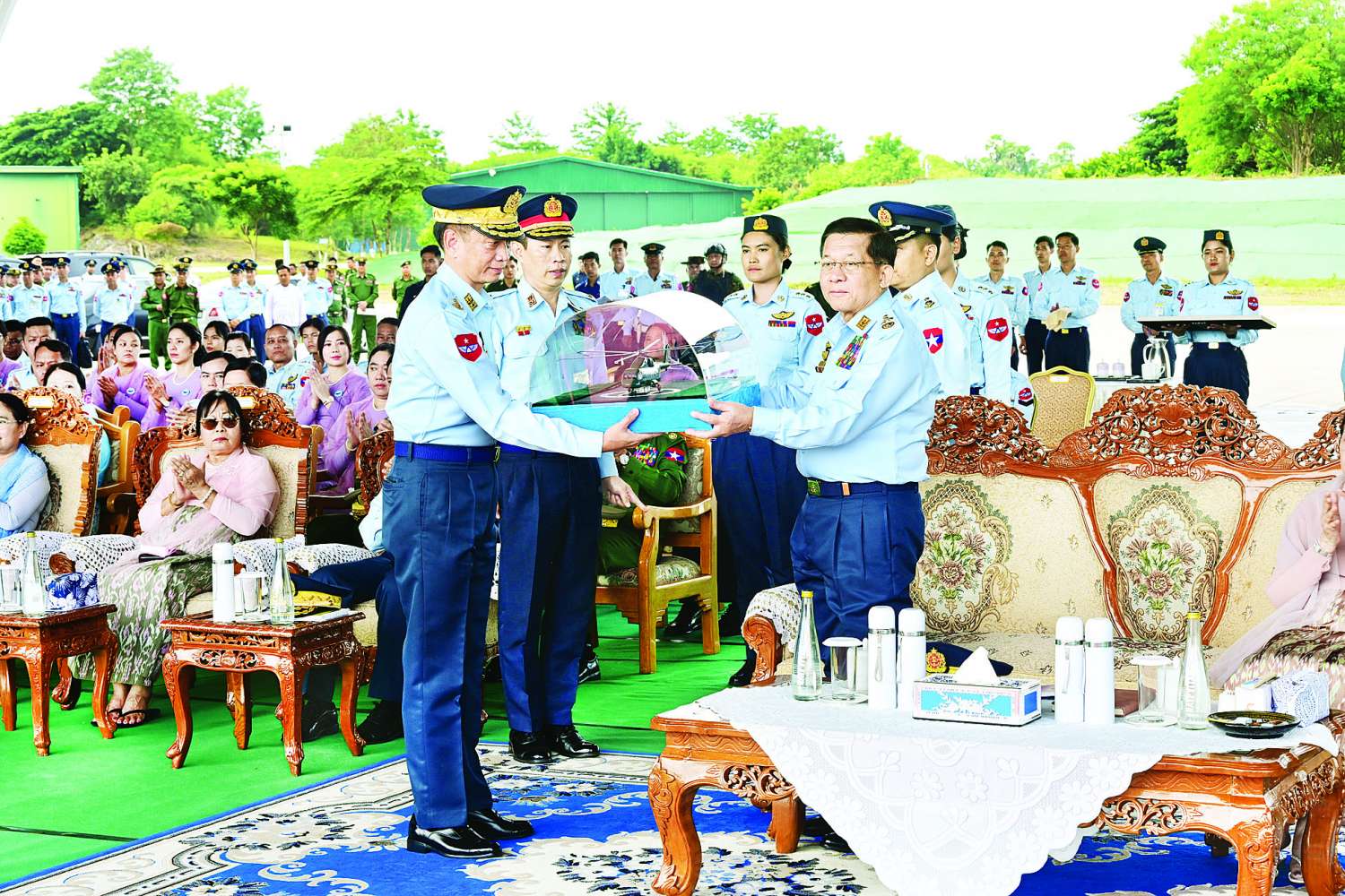 ဆက်လက်၍ နိုင်ငံတော်လုံခြုံရေးနှင့်အေးချမ်းသာယာရေးကော်မရှင်ဥက္ကဋ္ဌ တပ်မတော်ကာကွယ်ရေးဦးစီးချုပ် ဗိုလ်ချုပ်မှူးကြီး မင်းအောင်လှိုင်ထံ ကာကွယ်ရေးဦးစီးချုပ် (လေ) ဗိုလ်ချုပ်ကြီး ထွန်းအောင်က လေယာဉ်များ တပ်တော်ဝင်အထိမ်းအမှတ် လေယာဉ်ပုံစံငယ်ကို ဂါရဝပြုပေးအပ်သည်။