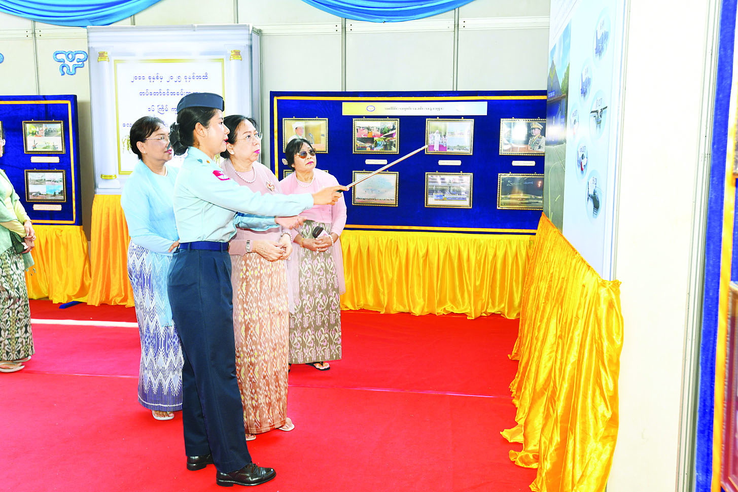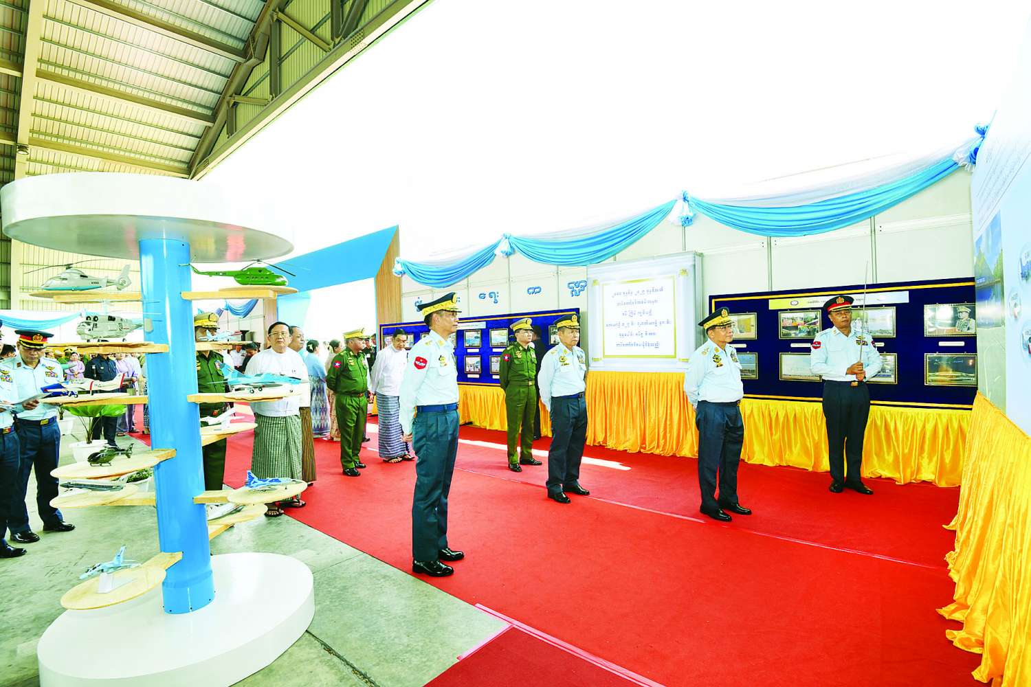 ယင်းနောက် နိုင်ငံတော်လုံခြုံရေးနှင့်အေးချမ်းသာယာရေးကော်မရှင်ဥက္ကဋ္ဌ တပ်မတော်ကာကွယ်ရေးဦးစီးချုပ်နှင့် ဇနီး၊ အဖွဲ့ဝင်များသည် တပ်မတော် (လေ) ၁၅ နှစ်တာကာလ တိုးတက်ပြောင်းလဲမှုပြခန်းအတွင်း ခင်းကျင်းပြသထားသည့် ပြခန်းများကို ပြကွက်တစ်ခုချင်းစီအလိုက် လှည့်လည်ကြည့်ရှုကြသည်။