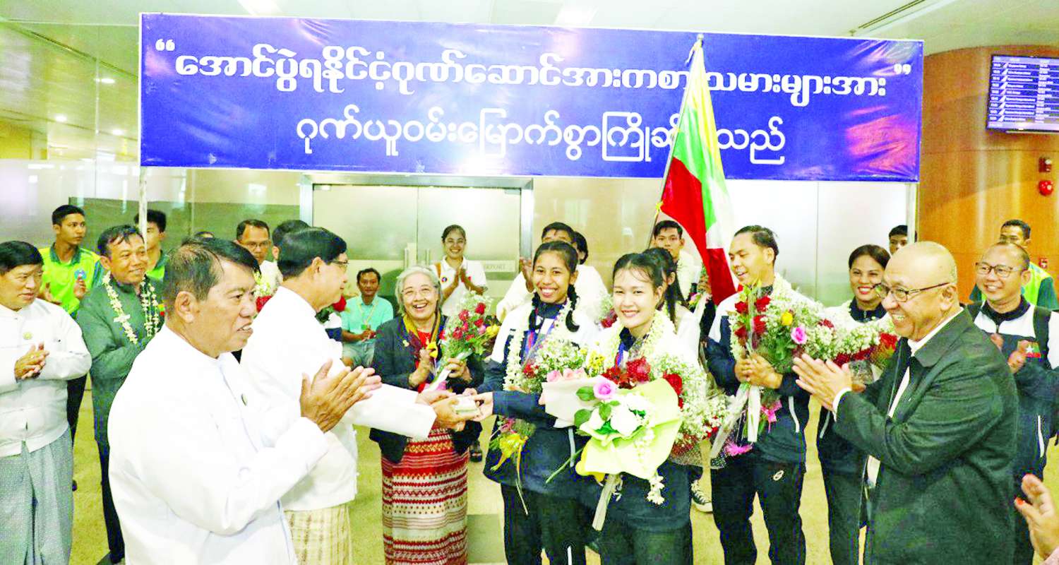 အောင်ပွဲရ မြန်မာဗိုဗီနမ်အသင်းသည် လေကြောင်းခရီးဖြင့် အင်ဒိုနီးရှားနိုင်ငံ ဘာလီမြို့မှ စင်ကာပူနိုင်ငံသို့လည်းကောင်း၊ စင်ကာပူနိုင်ငံမှတစ်ဆင့် ရန်ကုန်သို့ ယနေ့နံနက်ပိုင်းတွင် ပြန်လည်ရောက်ရှိလာရာ ရန်ကုန်တိုင်းဒေသကြီးဝန်ကြီးချုပ် ဦးစိုးသိန်းနှင့် တိုင်းဒေသကြီးဝန်ကြီးများ၊ အားကစားနှင့်ကာယပညာဦးစီးဌာနမှ ဒုတိယညွှန်ကြားရေးမှူးချုပ်နှင့် တာဝန်ရှိသူများ၊ အားကစားနှင့် ကာယပညာသိပ္ပံ(ရန်ကုန်)မှ သင်တန်းသား သင်တန်းသူများက သောင်းသောင်းဖြဖြ လာရောက်ကြိုဆိုခဲ့ကြောင်း သိရသည်။