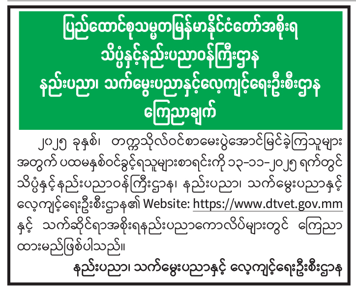 ပြည်ထောင်စုသမ္မတမြန်မာနိုင်ငံတော်အစိုးရ သိပ္ပံနှင့်နည်းပညာဝန်ကြီးဌာန နည်းပညာ၊ သက်မွေးပညာနှင့်လေ့ကျင့်ရေးဦးစီးဌာန ကြေညာချက် 11/13/2025