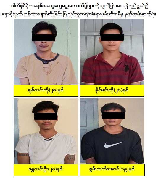 ထိုသို့ ဆောင်ရွက်လျက်ရှိရာ နိုဝင်ဘာလ ၁၄ ရက်နေ့ နံနက် ၃ နာရီ ၅ မိနစ်အချိန်တွင် သင်္ဃန်းကျွန်းမြို့မရဲစခန်းမှ တပ်ဖွဲ့ဝင်များပါဝင်သော ပူးပေါင်းအဖွဲ့သည် နယ်မြေအတွင်း လှည့်ကင်းဆောင်ရွက်နေစဉ် ရန်ကုန်တိုင်းဒေသကြီး၊ သင်္ဃန်းကျွန်းမြို့နယ်၊ လေးထောင့်ကန်ရပ်ကွက်၊ လေးထောင့်ကန်လမ်းနှင့် ဦးဘဟန်လမ်းထောင့်ရှိ ပန်းခြံတွင် စိုက်ထူထားသည့် ပြည်ထောင်စုကြံ့ခိုင်ရေးနှင့်ဖွံ့ဖြိုးရေးပါတီ ဆိုင်းဘုတ် ၁ ခု၊ ဗိုလ်ကံညွန့်ရပ်ကွက်ရှိ လေးထောင့်ကန်လမ်းနှင့် ဇမ္ဗူဒိပ်လမ်းထောင့်တွင် စိုက်ထူထားသည့် ပြည်သူ့ပါတီဆိုင်းဘုတ် ၁ ခု၊ သုမင်္ဂလာရပ်ကွက်ရှိလေးထောင့်ကန်လမ်းနှင့် သုမင်္ဂလာလမ်းထောင့်(ဇဝနလမ်းဆုံ)တွင် စိုက်ထူထားသည့် ပြည်သူ့ပါတီဆိုင်းဘုတ် ၁ ခုနှင့် ပြည်သူ့ရှေ့ဆောင်ပါတီ ဆိုင်းဘုတ် ၁ ခုတို့အား ဖြိုလှဲဖျက်ဆီးနေကြောင်း သတင်းအရပါတီဆိုင်းဘုတ်များဖျက်ဆီးခဲ့သည့် တရားခံများအား ဖမ်းဆီးရမိနိုင်ရေးဆောင်ရွက်ခဲ့ရာ ပြစ်မှုကျူးလွန်ရာတွင်ပါဝင်သူ သင်္ဃန်းကျွန်းမြို့နယ်၊ ရန်အောင်ရပ်ကွက်နေ ရွှေလင်းဦး(၂၀)နှစ်နှင့် ဗိုလ်ကံညွန့်ရပ်ကွက်နေ ခိုင်မင်းကို(၂၀)နှစ်တို့ ၂ ဦးအား ယင်းနေ့နံနက် ၃ နာရီ ၁၀ မိနစ်အချိန်တွင် အခင်းဖြစ်နေရာအနီး ဦးစံဖေရပ်ကွက်၊ ဘုရင့်နောင်လမ်း၌လည်းကောင်း၊ ရန်အောင်ရပ်ကွက်နေသူများဖြစ်ကြသည့် စွမ်းထက်အောင်(၁၉)နှစ်အား နံနက် ၄ နာရီ ၅ မိနစ်အချိန်တွင် ရန်အောင်ရပ်ကွက်၊ ရန်အောင်လမ်းရှိ ၎င်း၏အဒေါ်ဖြစ်သူနေအိမ်မှလည်းကောင်း၊ ချစ်လင်းကို(၂၈)နှစ်အား နံနက် ၅ နာရီအချိန်တွင် ဗိုလ်ကံညွန့်ရပ်ကွက်၊ ဇမ္ဗူကျက်သရေဆောင်လမ်းရှိ ၎င်း၏အသိဖြစ်သူ နေအိမ်မှလည်းကောင်း အသီးသီးဖမ်းဆီးရမိခဲ့သည်။