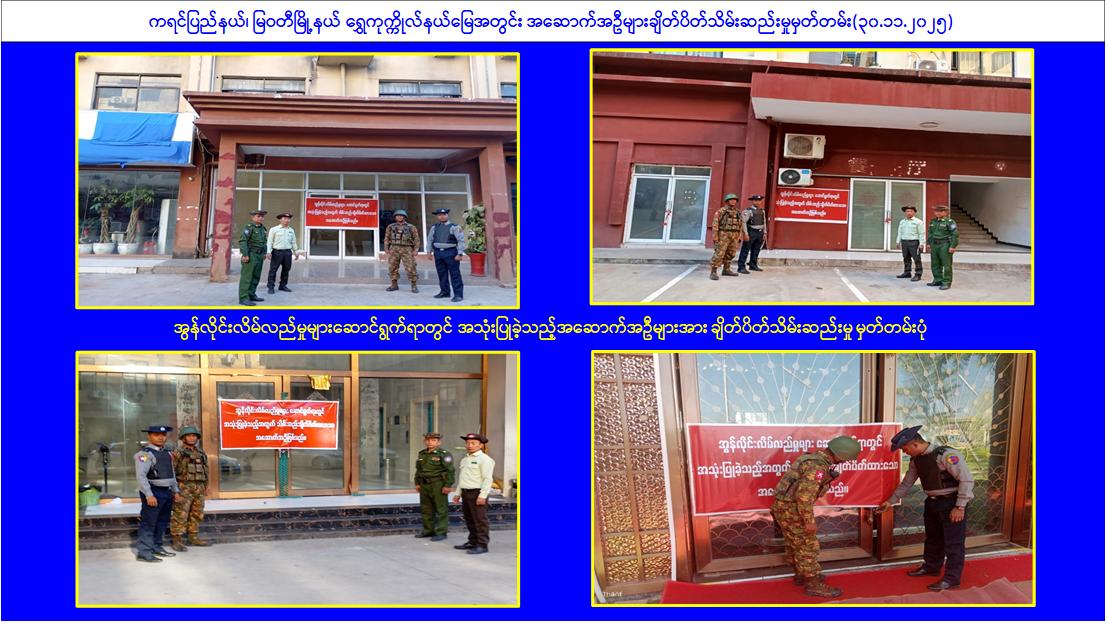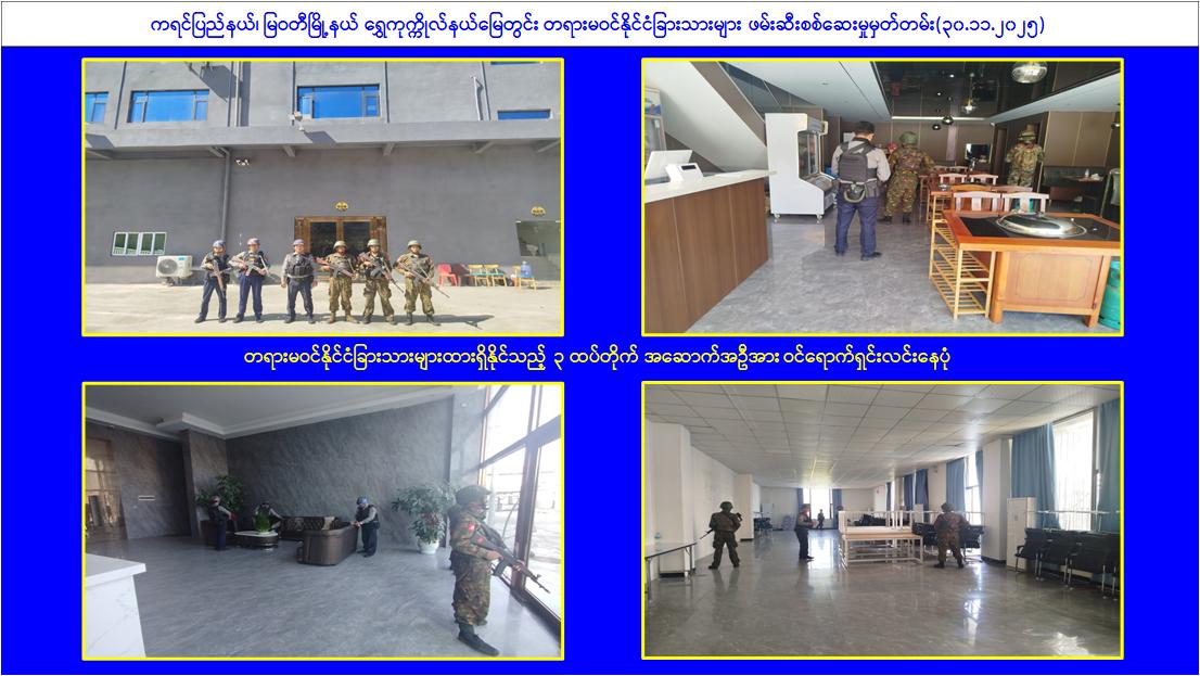 ထို့ပြင် ရွှေကုက္ကိုလ်နယ်မြေအတွင်း အွန်လိုင်းလိမ်လည်မှုများ လုပ်ဆောင်ရာတွင် အသုံးပြုခဲ့သည့် အဆောက်အအုံများအား နိုဝင်ဘာ ၁၈ ရက်မှ စတင်စစ်ဆေးခဲ့ရာ ယနေ့အထိ တရားမဝင်အဆောက်အအုံ ၁၄၀ လုံးကို စစ်ဆေးတွေ့ရှိရပြီး အဆိုပါအဆောက်အအုံများကို ပြန်လည်အသုံးပြုမှုမရှိစေရေးအတွက် သိမ်းဆည်းချိပ်ပိတ်ခြင်းများကို ဆက်လက်ဆောင်ရွက်လျက်ရှိရာ ယနေ့အတွင် တရားမဝင်အဆောက်အအုံ ၁၈ လုံးကို ထပ်မံချိပ်ပိတ်သိမ်းဆည်းနိုင်ခဲ့ပြီး တရားမဝင်အဆောက်အအုံ စုစုပေါင်း ၁၁၉ လုံး ချိပ်ပိတ်သိမ်းဆည်းပြီးဖြစ်ကြောင်း သိရှိရသည်။